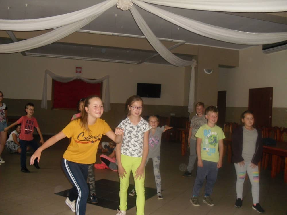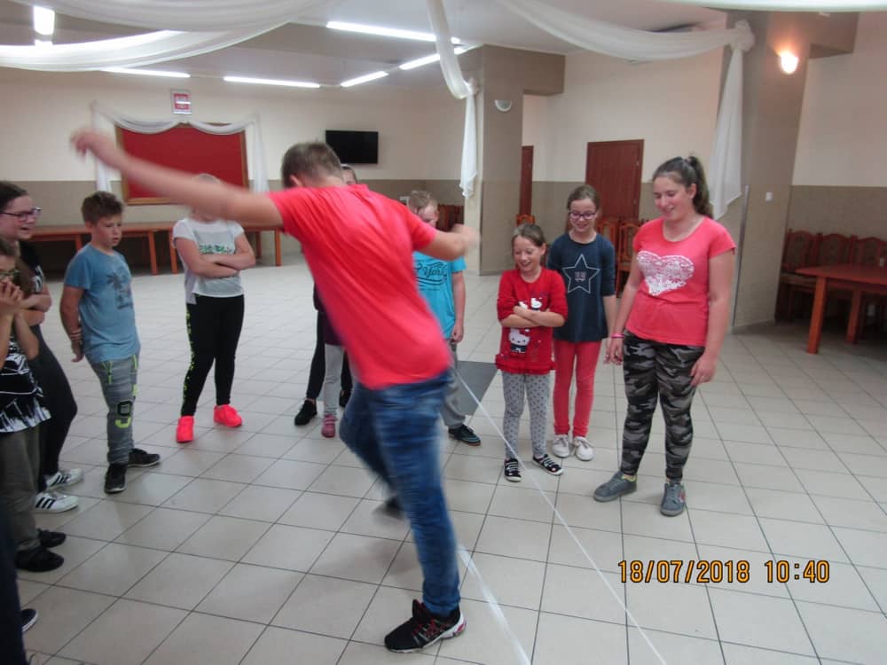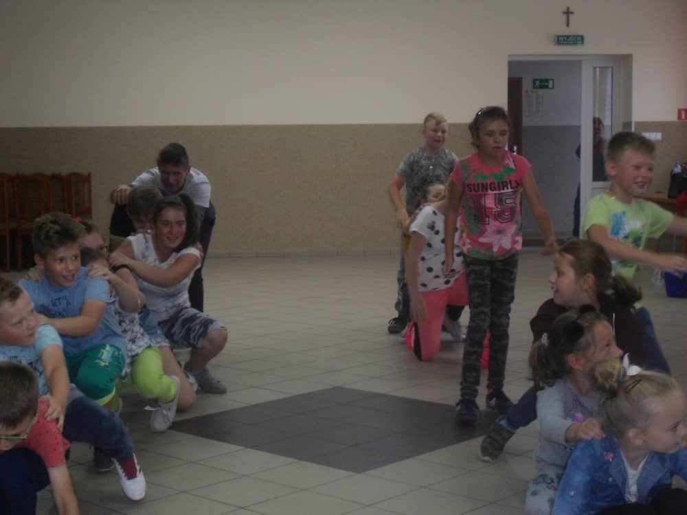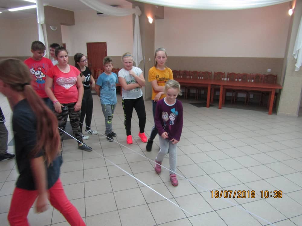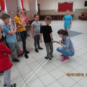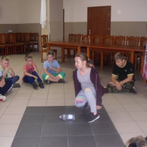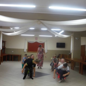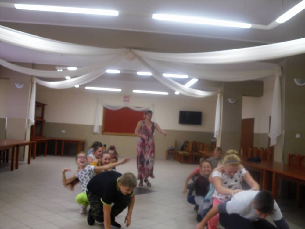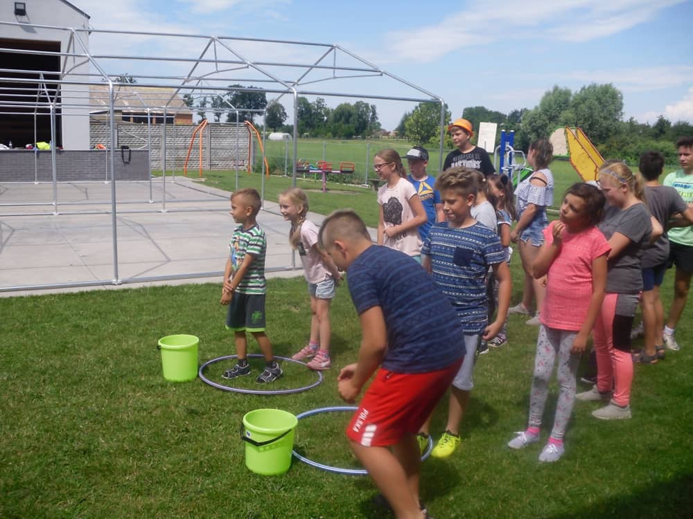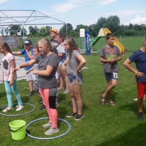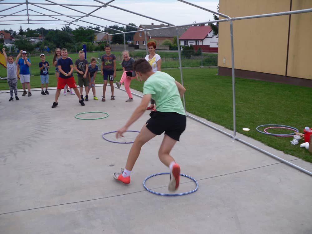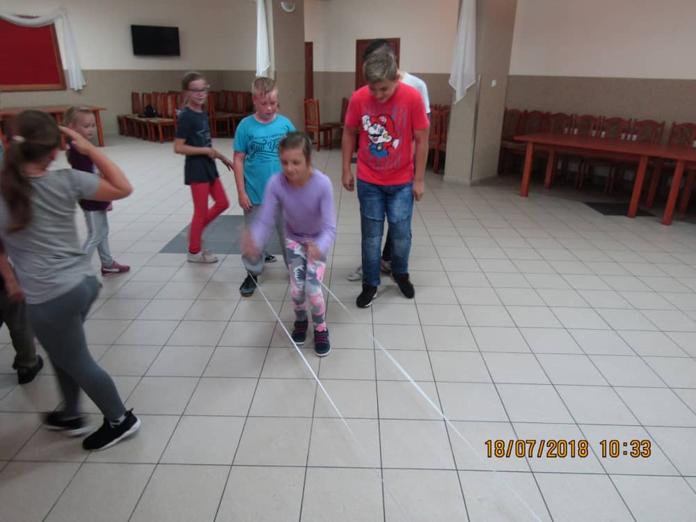 W kolejnych dwóch dniach pogoda sprawiła nam psikusa, dlatego zajęcia odbywały się na sali wiejskiej w Łagiewnikach. Tu również dzieci brały udział w grach i zabawach sprawnościowych, a gościnnie pomagała w prowadzeniu zabaw Pani Justyna Küffner. Bardzo atrakcyjną okazała się zabawa wiewiórki w dziupli. W ciuciubabce z zawiązanymi oczami należało złapać jakąś osobę i odgadnąć kto to jest. Podczas zabawy w pytanie czy wyzwanie większość uczestników wybierała pytanie. Dużą trudność, chociaż na wesoło, sprawiło przejście do mety jako stonoga.