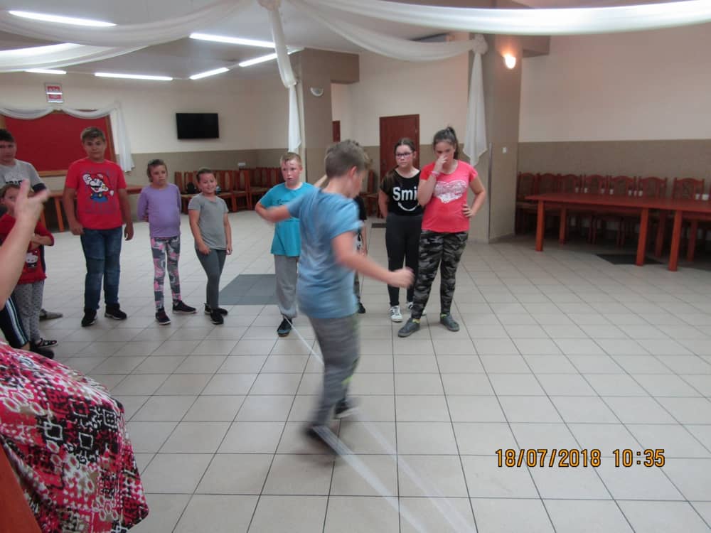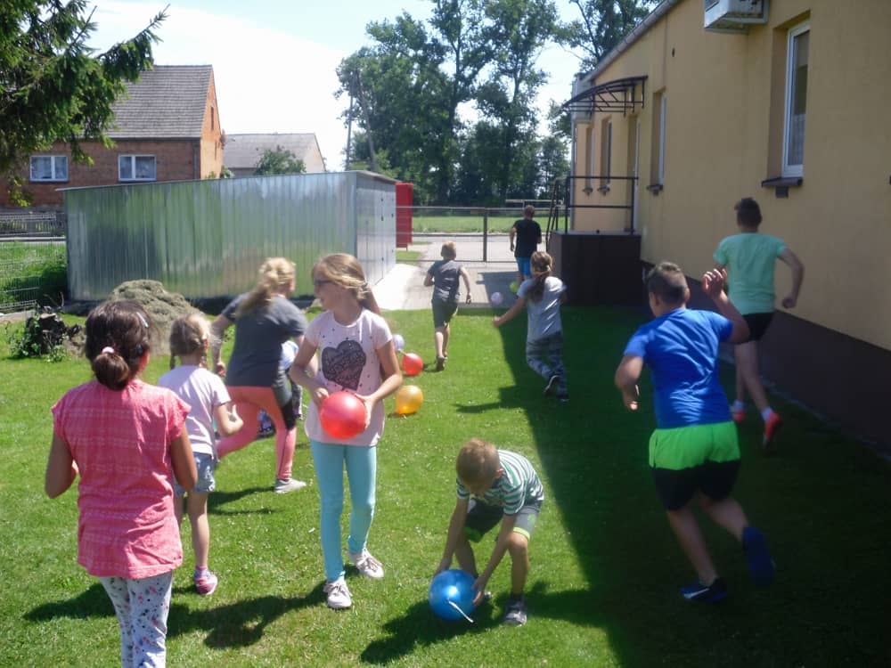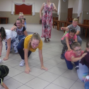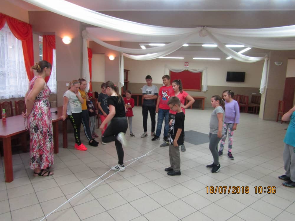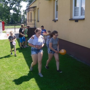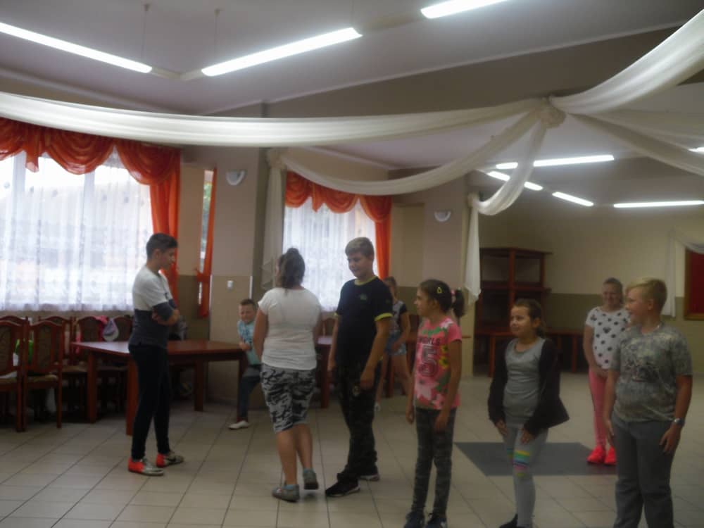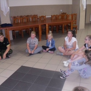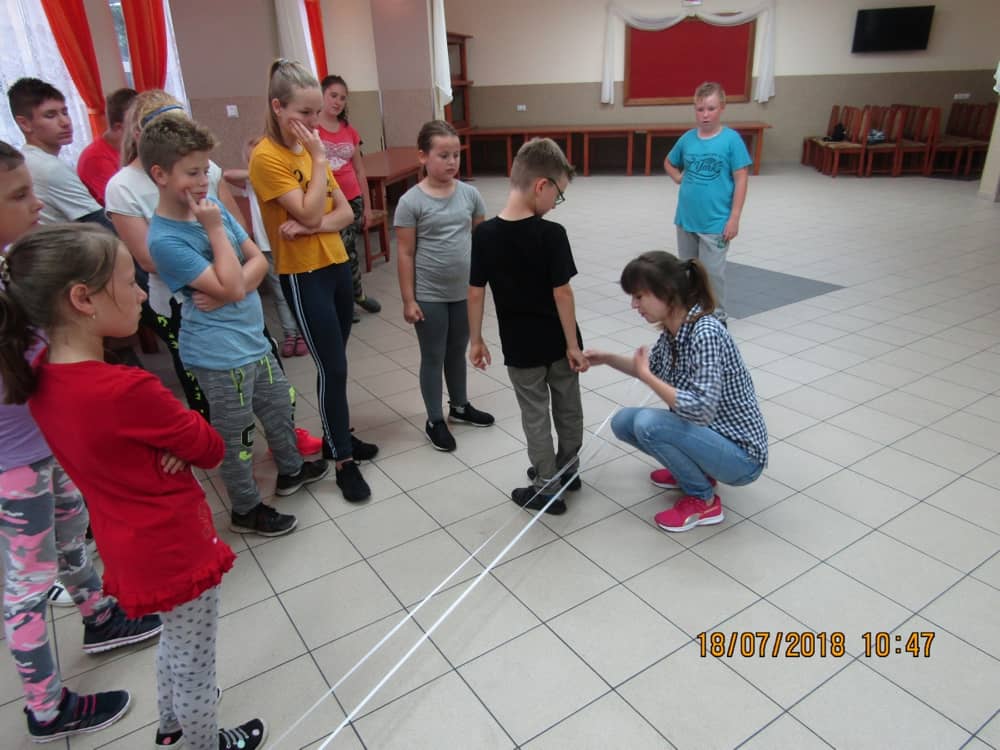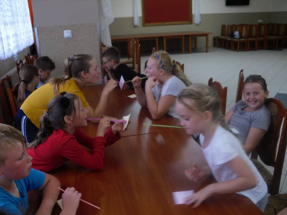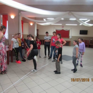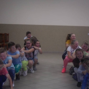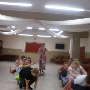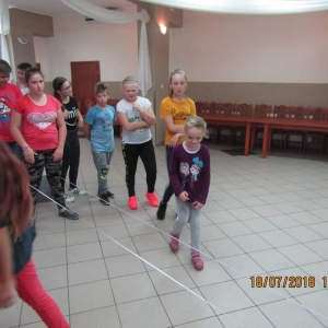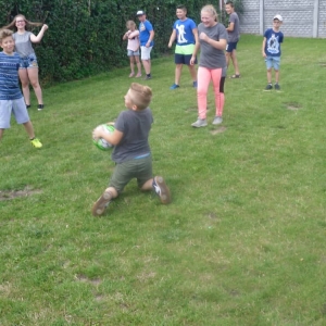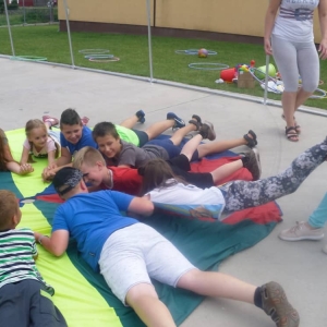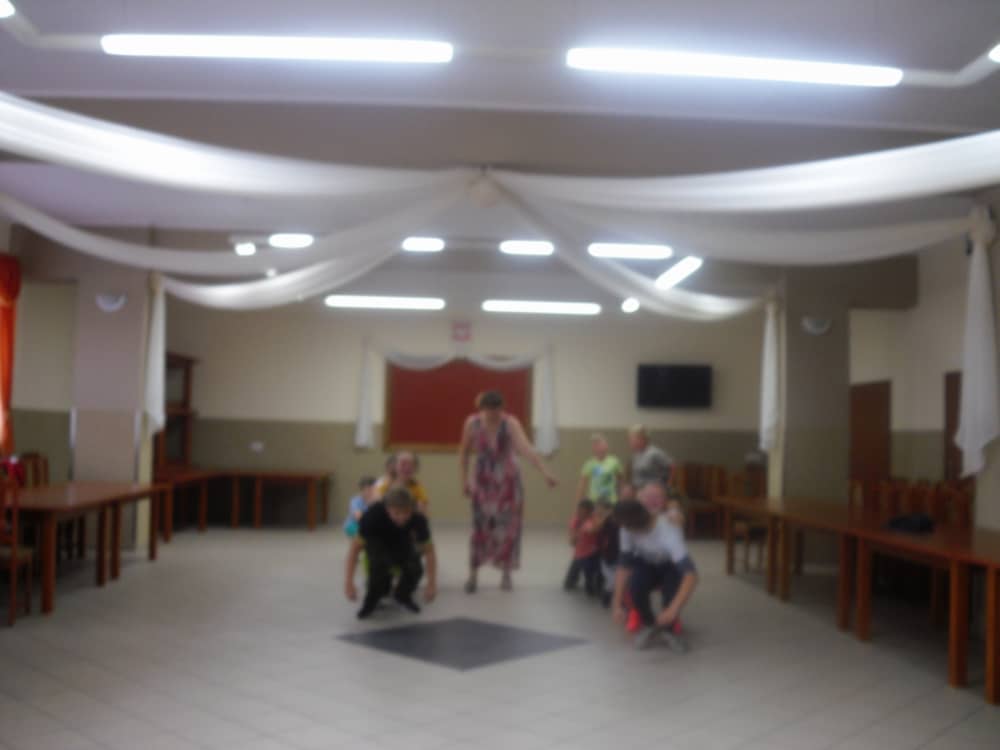 W kolejnych dwóch dniach pogoda sprawiła nam psikusa, dlatego zajęcia odbywały się na sali wiejskiej w Łagiewnikach. Tu również dzieci brały udział w grach i zabawach sprawnościowych, a gościnnie pomagała w prowadzeniu zabaw Pani Justyna Küffner. Bardzo atrakcyjną okazała się zabawa wiewiórki w dziupli. W ciuciubabce z zawiązanymi oczami należało złapać jakąś osobę i odgadnąć kto to jest. Podczas zabawy w pytanie czy wyzwanie większość uczestników wybierała pytanie. Dużą trudność, chociaż na wesoło, sprawiło przejście do mety jako stonoga.