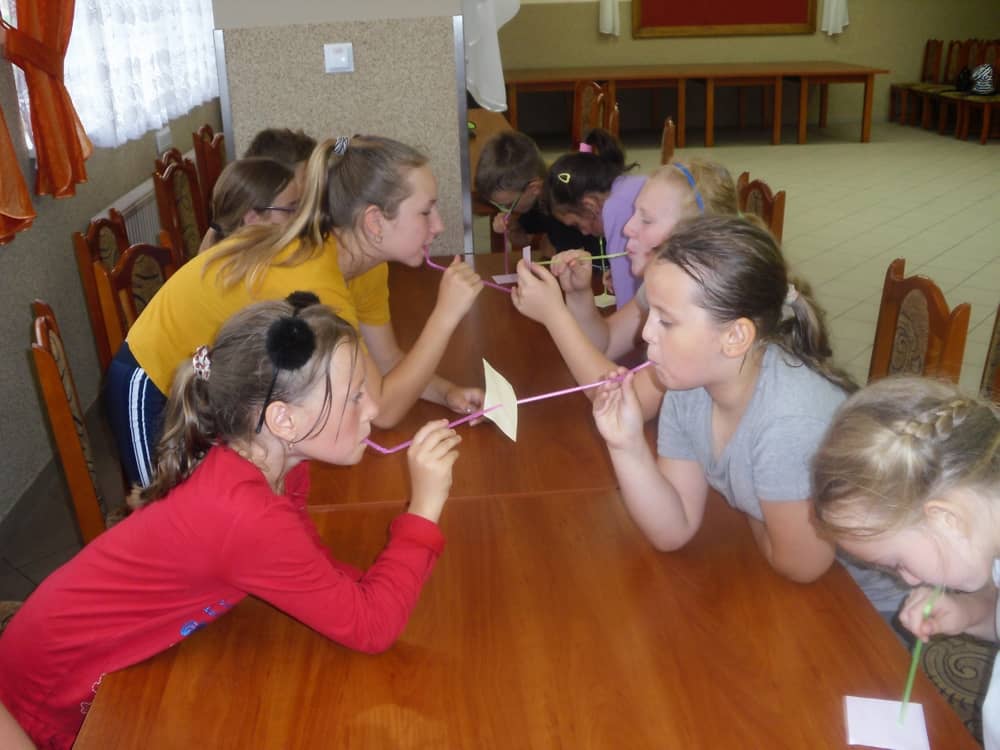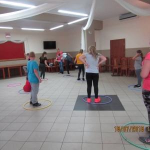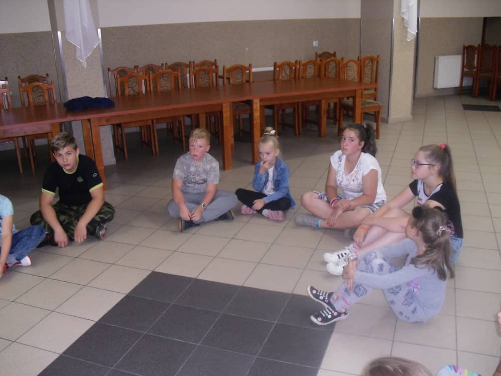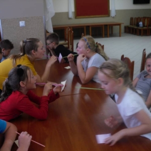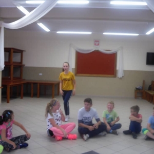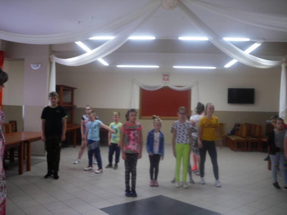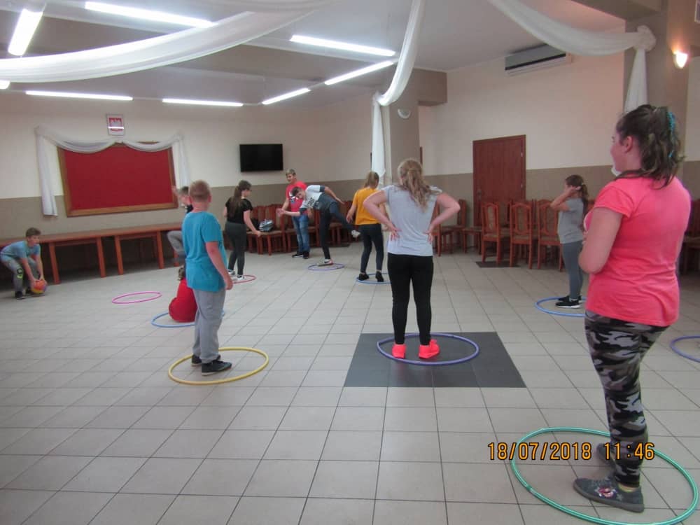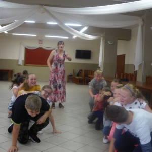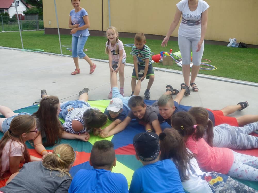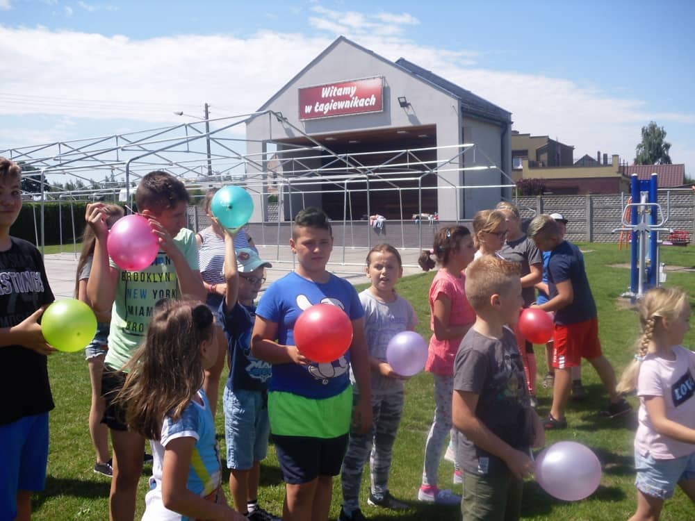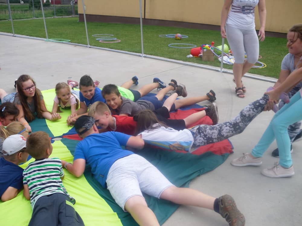 W kolejnych dwóch dniach pogoda sprawiła nam psikusa, dlatego zajęcia odbywały się na sali wiejskiej w Łagiewnikach. Tu również dzieci brały udział w grach i zabawach sprawnościowych, a gościnnie pomagała w prowadzeniu zabaw Pani Justyna Küffner. Bardzo atrakcyjną okazała się zabawa wiewiórki w dziupli. W ciuciubabce z zawiązanymi oczami należało złapać jakąś osobę i odgadnąć kto to jest. Podczas zabawy w pytanie czy wyzwanie większość uczestników wybierała pytanie. Dużą trudność, chociaż na wesoło, sprawiło przejście do mety jako stonoga.