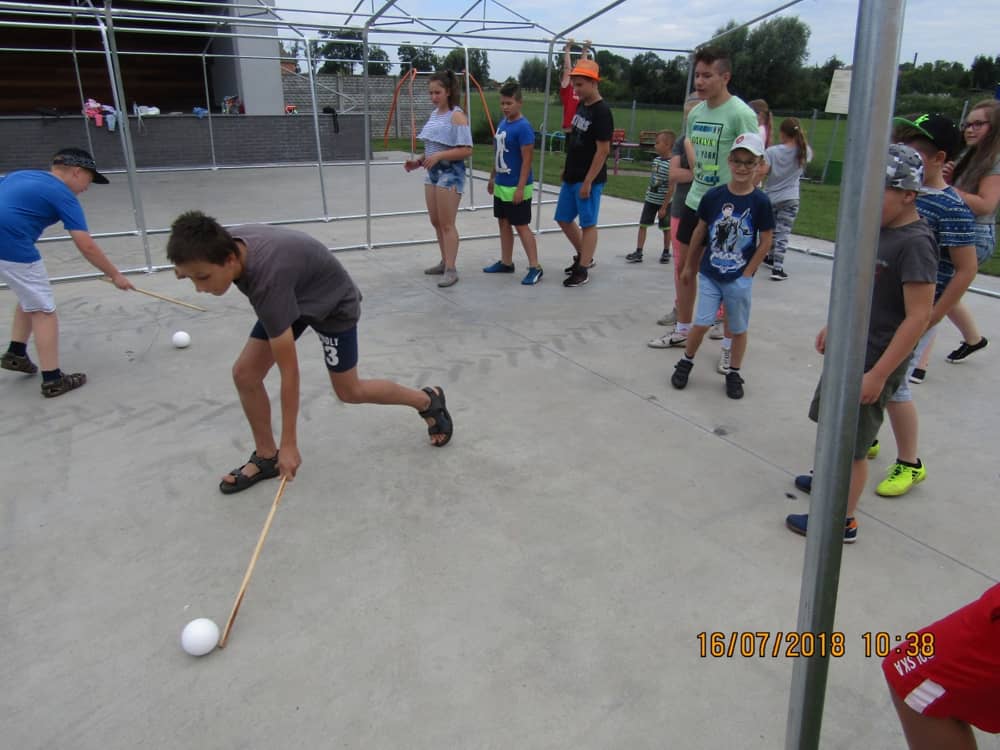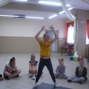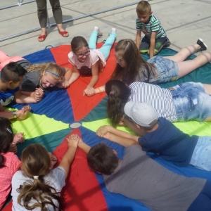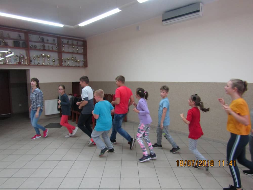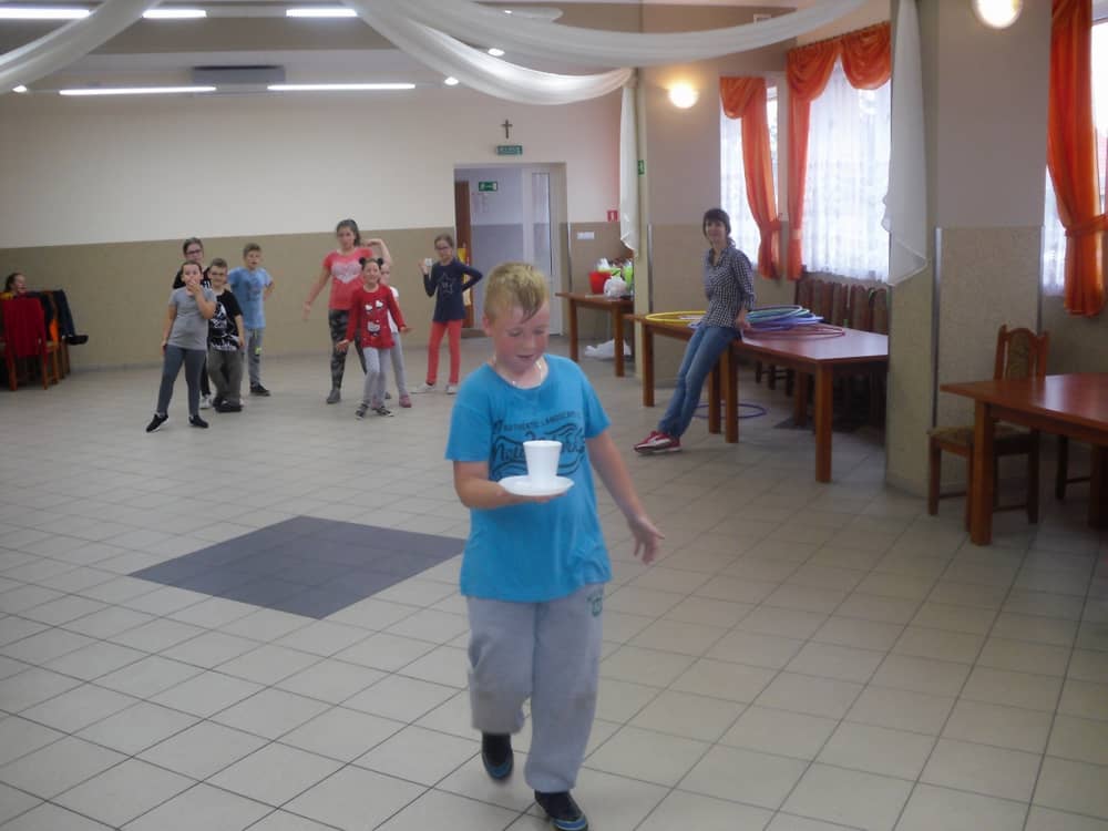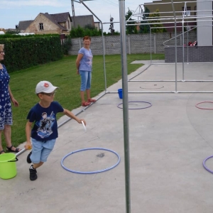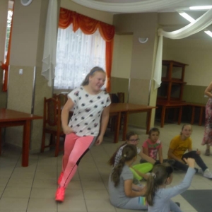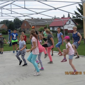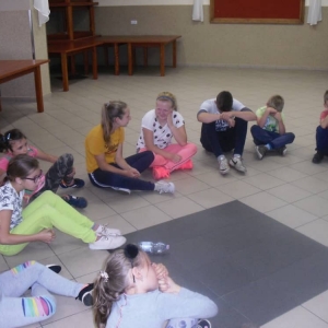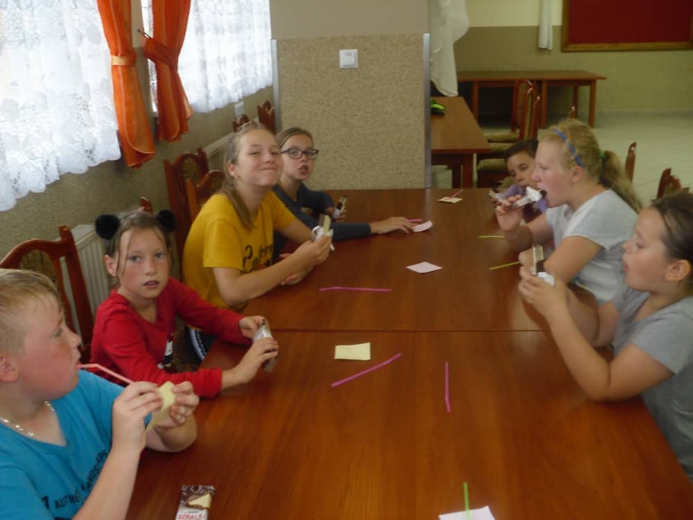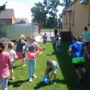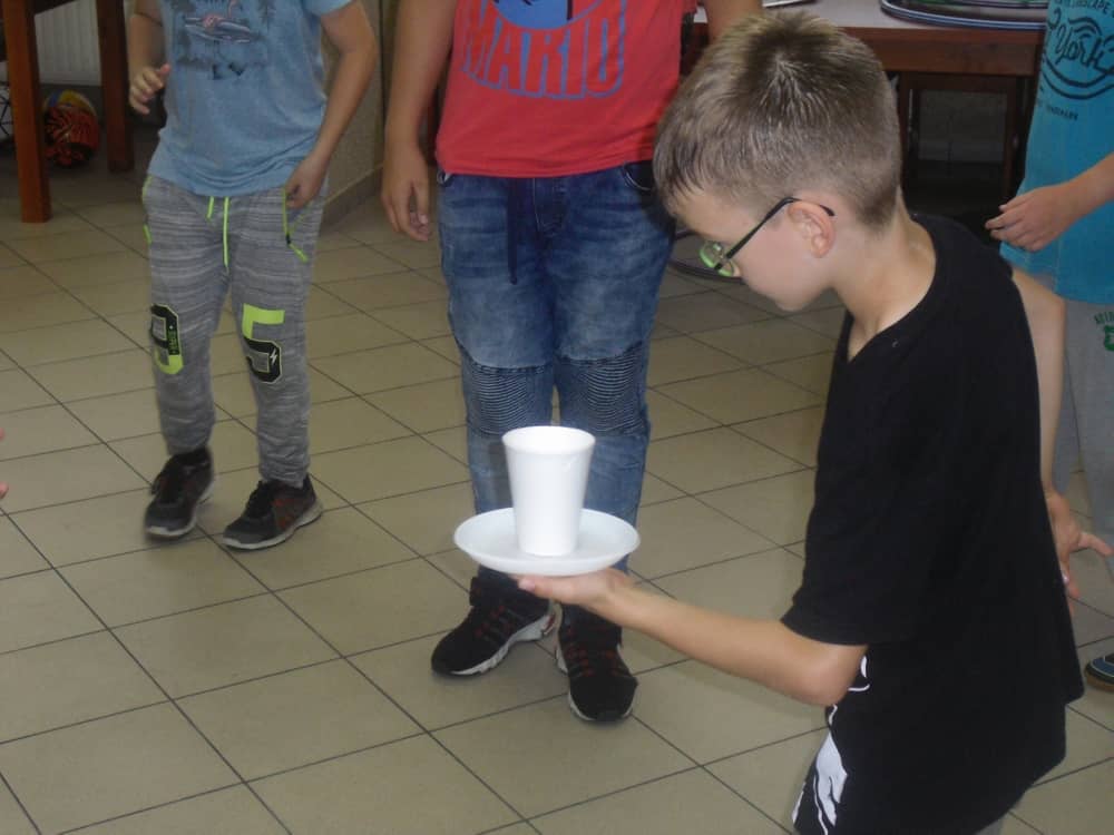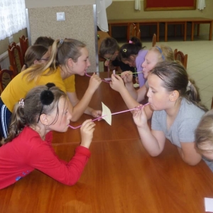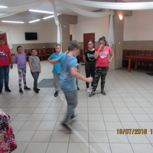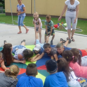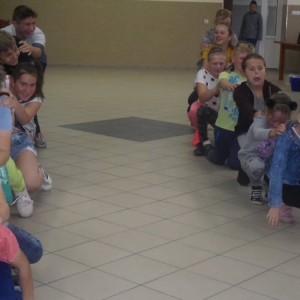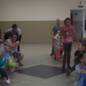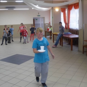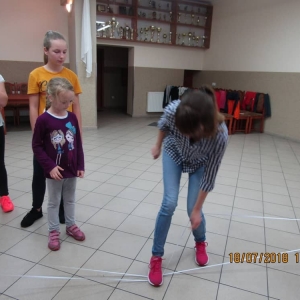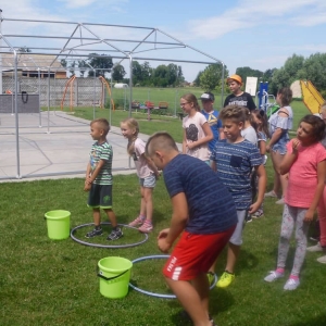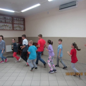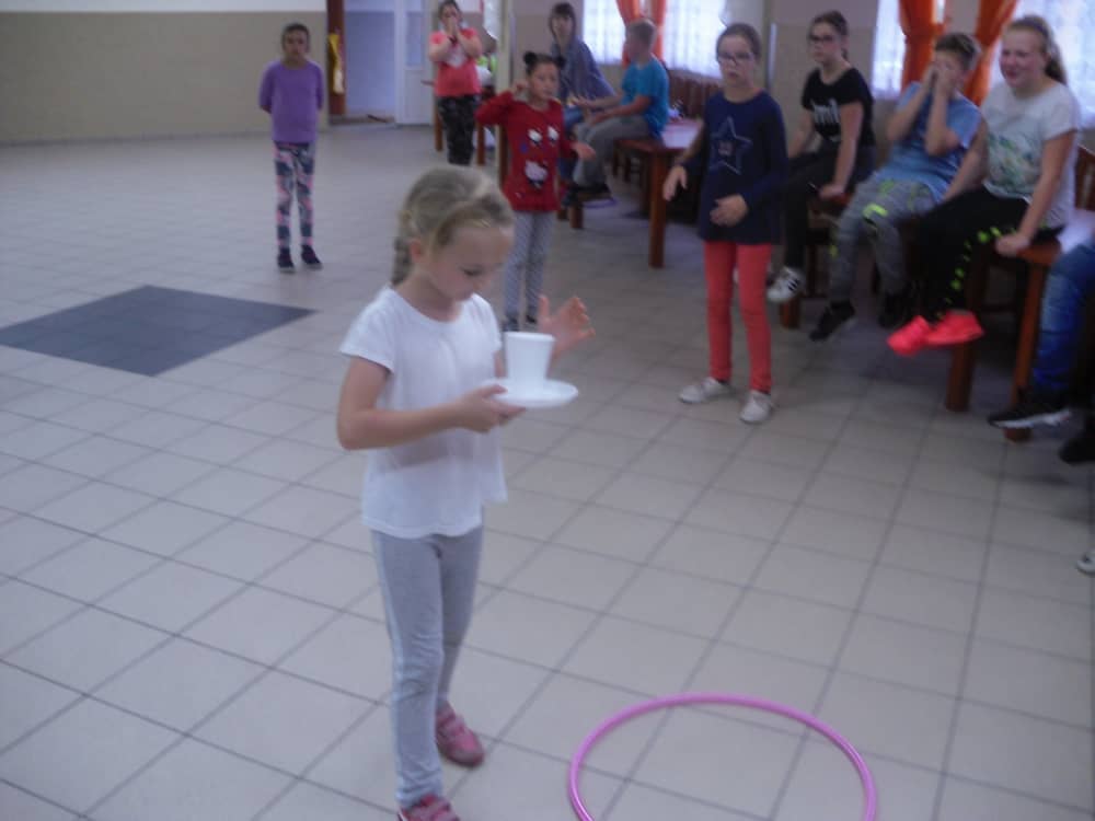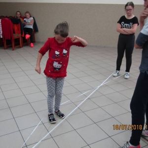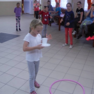 W ostatnim dniu zajęć dzieci grały w gumę. Nie zabrakło także wyścigów i zabaw z rywalizacją. Sporo trudności sprawił bieg kelnera podczas którego należało dojść do wyznaczonej linii, niosąc talerzyk, a na nim kubek. Podczas kulawego berka osoba klepnięta, trzymała się za dotknięte miejsce co utrudniało ucieczkę. Na koniec dzieci zagrały w koło fortuny, w którym trzeba było odgadnąć tytuł bajki. Po tak wyczerpujących zajęciach, każdy z uczestników pokrzepił się słodyczami.