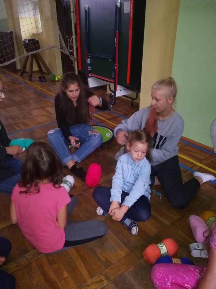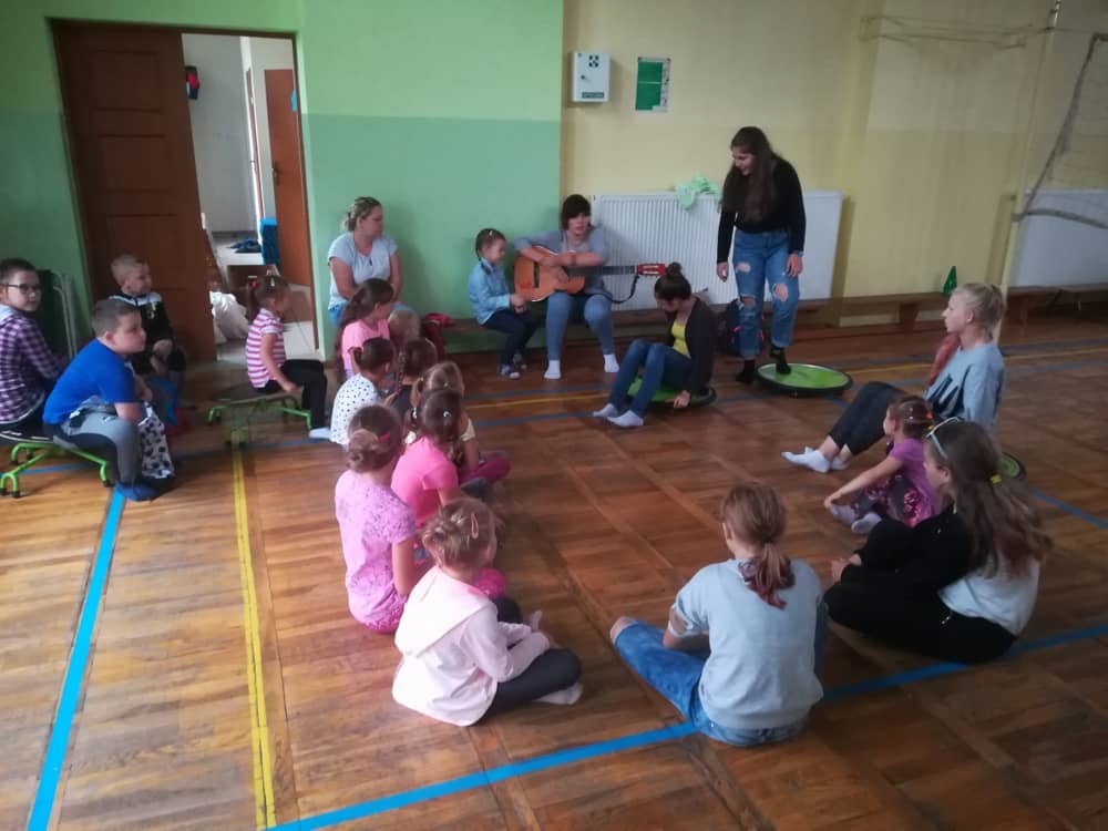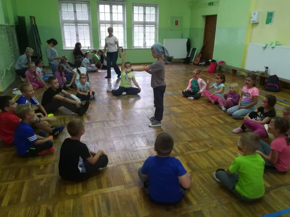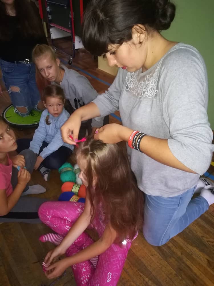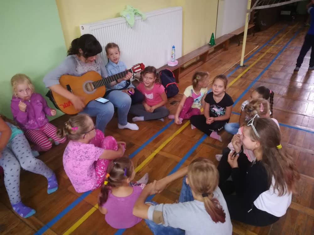 Pierwszego dnia zajęć udaliśmy się do sali gimnastycznej w Smolicach, gdzie po krótkiej rozgrzewce odbyły się wyścigi oraz ulubiona gra rozrywka chłopców- gra w piłkę nożną. Młodsi uczestnicy śpiewali piosenki, których melodię grała na gitarze Julia Jarus. Atrakcją dla dzieci było malowanie twarzy oraz uplatanie kolorowych warkoczy.