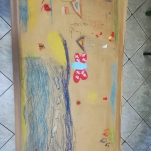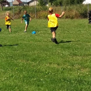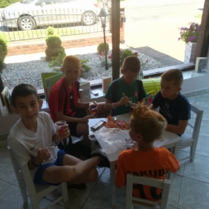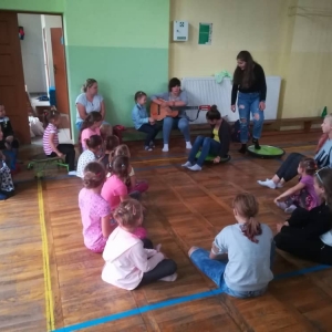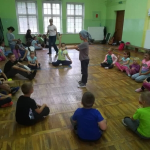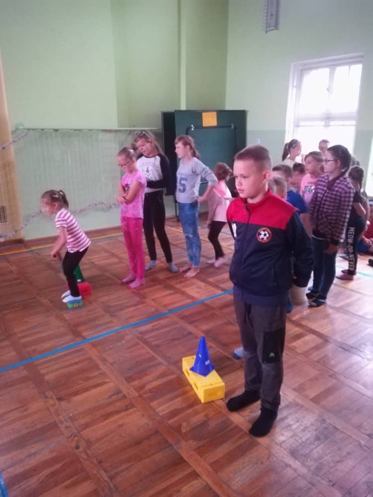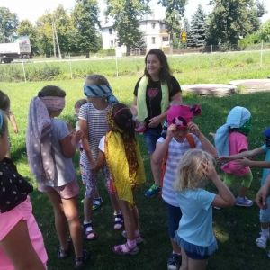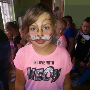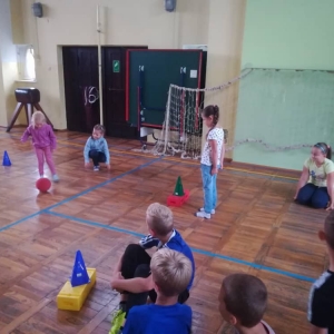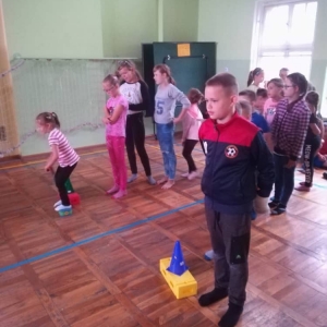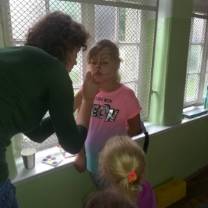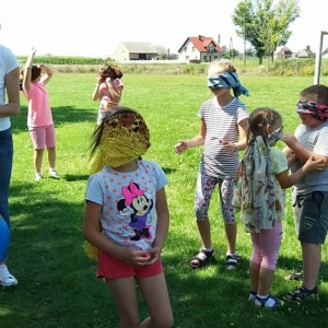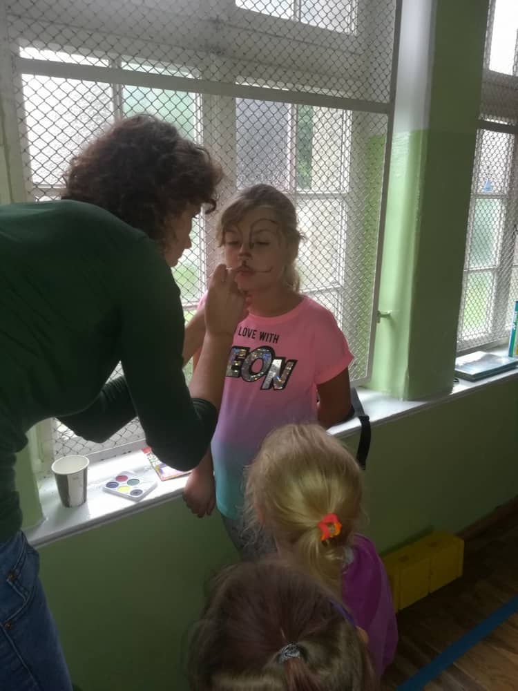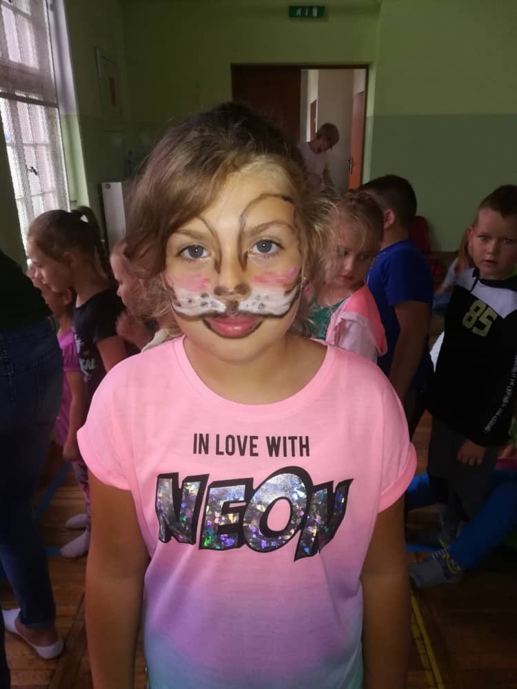 Pierwszego dnia zajęć udaliśmy się do sali gimnastycznej w Smolicach, gdzie po krótkiej rozgrzewce odbyły się wyścigi oraz ulubiona gra rozrywka chłopców- gra w piłkę nożną. Młodsi uczestnicy śpiewali piosenki, których melodię grała na gitarze Julia Jarus. Atrakcją dla dzieci było malowanie twarzy oraz uplatanie kolorowych warkoczy.