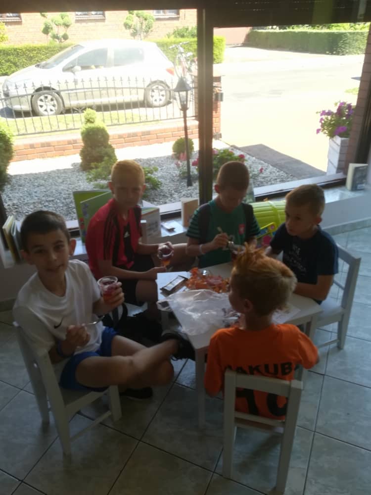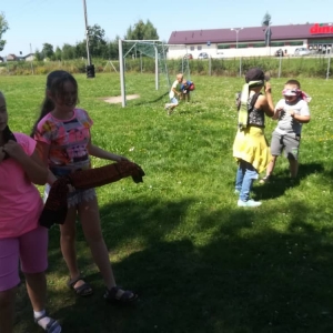 Po grze terenowej wyruszyliśmy na boisko przy Szkole Podstawowej w Smolicach. Tam odbył się mecz piłki nożnej oraz wiele innych zabaw. Na zakończenie ,,Wakacji z Biblioteką" każdy uczestnik otrzymał imienne podziękowanie, słodki upominek oraz deser.