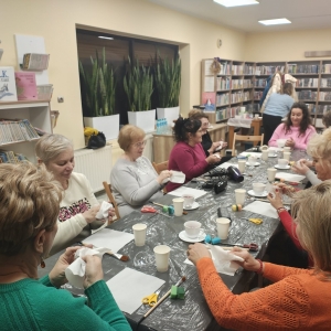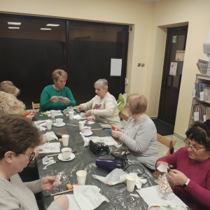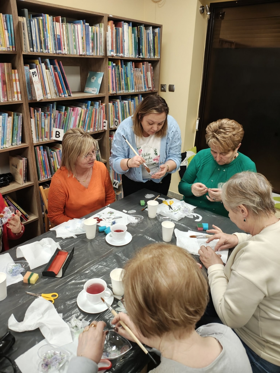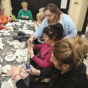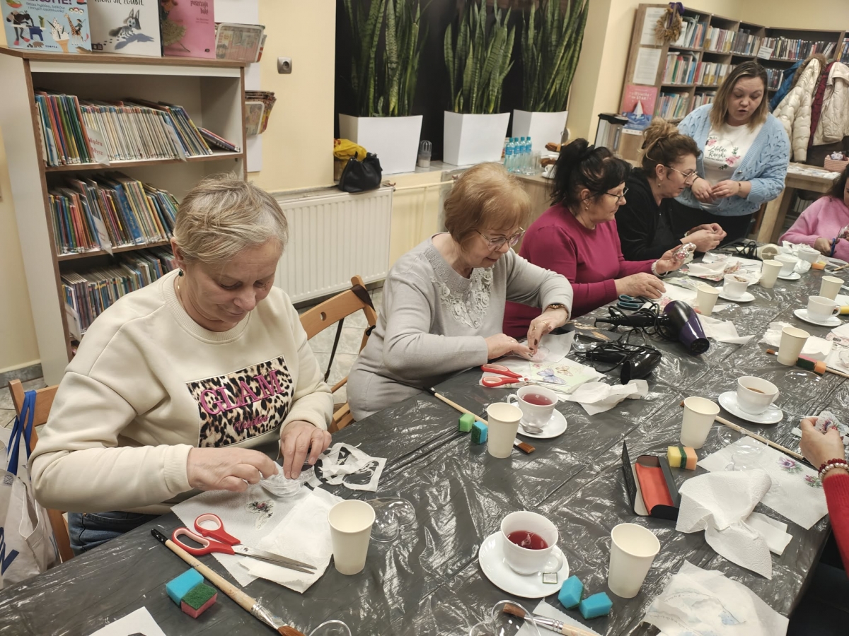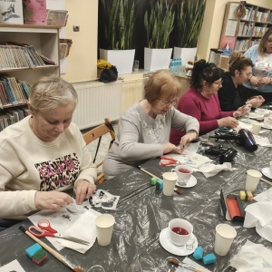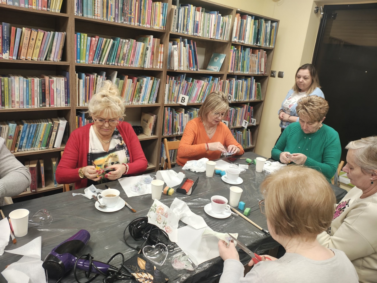 Galeria zawiera zdjęcia z warsztatów rękodzielniczych podczas których uczestniczki zajęć tworzyły walentynkowe serca metodą decoupage. Zdjęcia przedstawiają Panie podczas pracy: wycinających elementy, malujących serca, suszących swoje ozdoby.