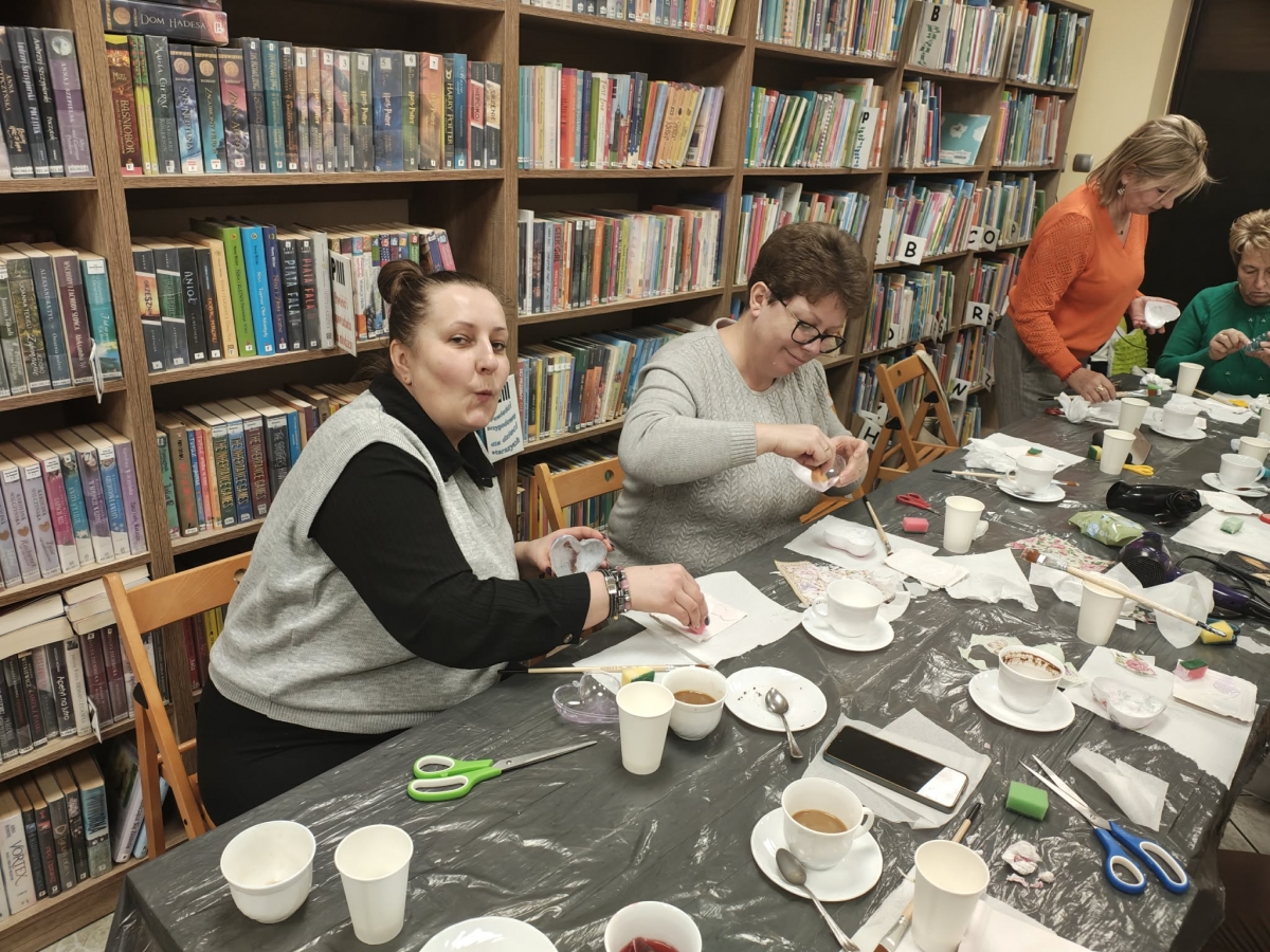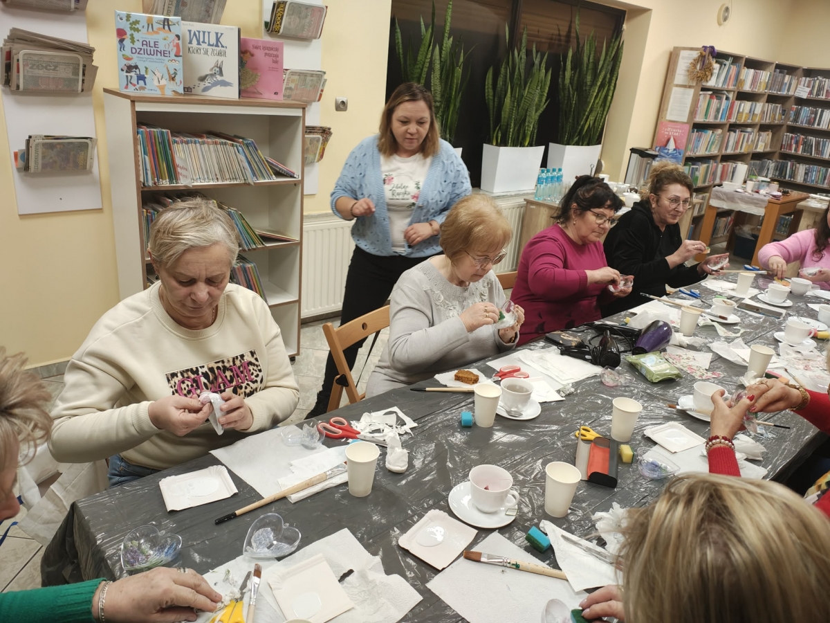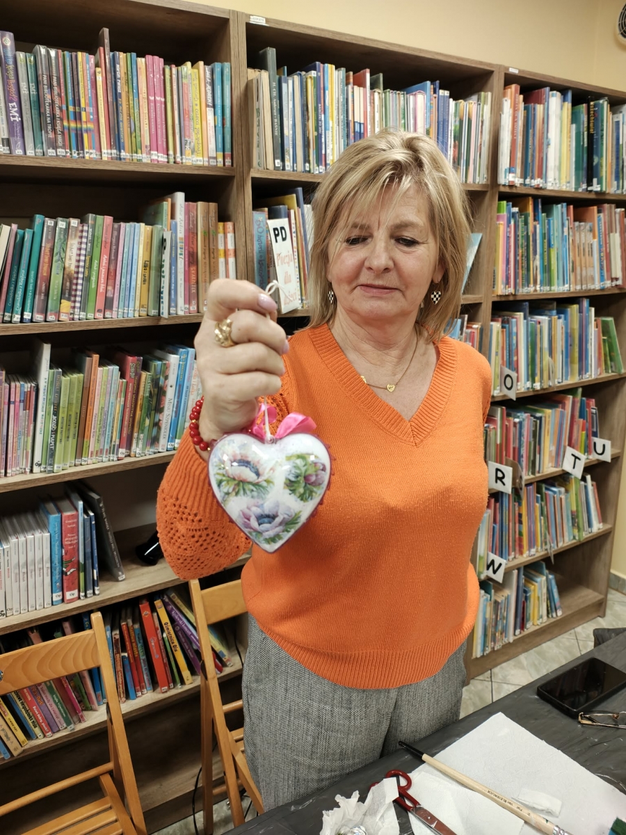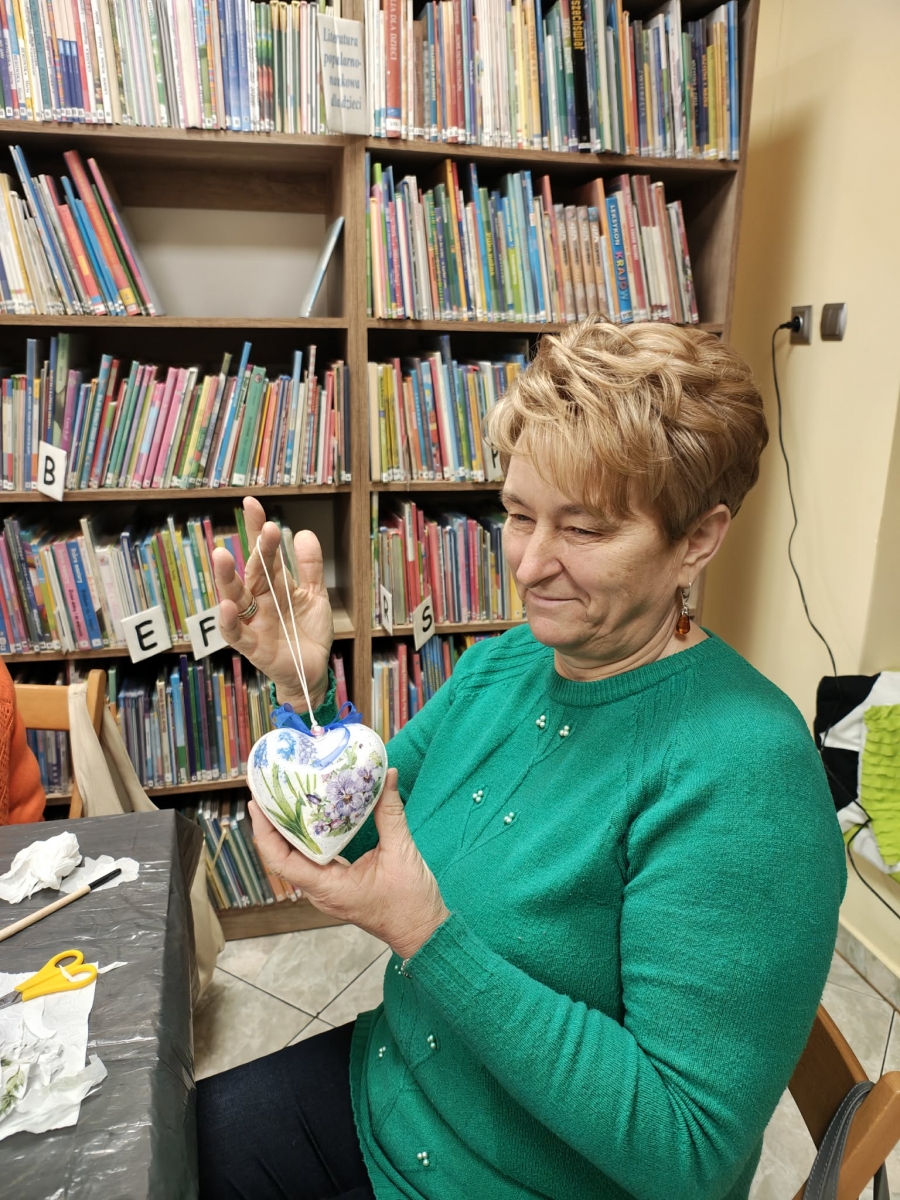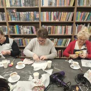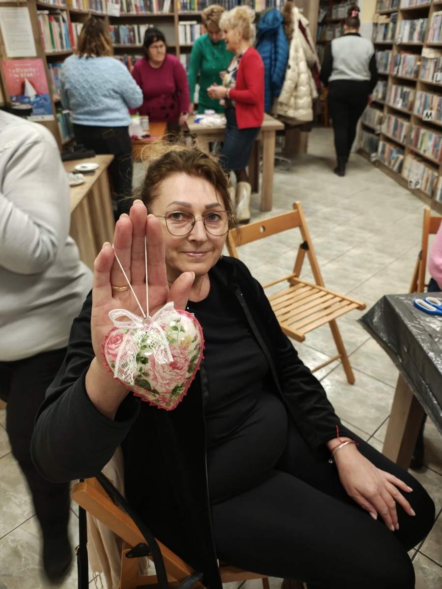 W piątek 30 stycznia w Filii Bibliotecznej odbyło się kolejne spotkanie z cyklu Rękodzieło w Bibliotece. Tym razem uczestniczki próbowały swoich sił w decoupage. Miłośniczki rękodzieła pod czujnym okiem prowadzącej Pani Eweliny Adler (Zdolne Rączki) tworzyły walentynkowe serca. Pani Ewelina to utalentowana lokalna rękodzielniczka, której pasją jest tworzenie unikatowych ozdób z drewna, plastiku, szkła. Wszystko ozdabia papierowymi serwetkami i farbami.