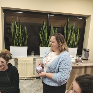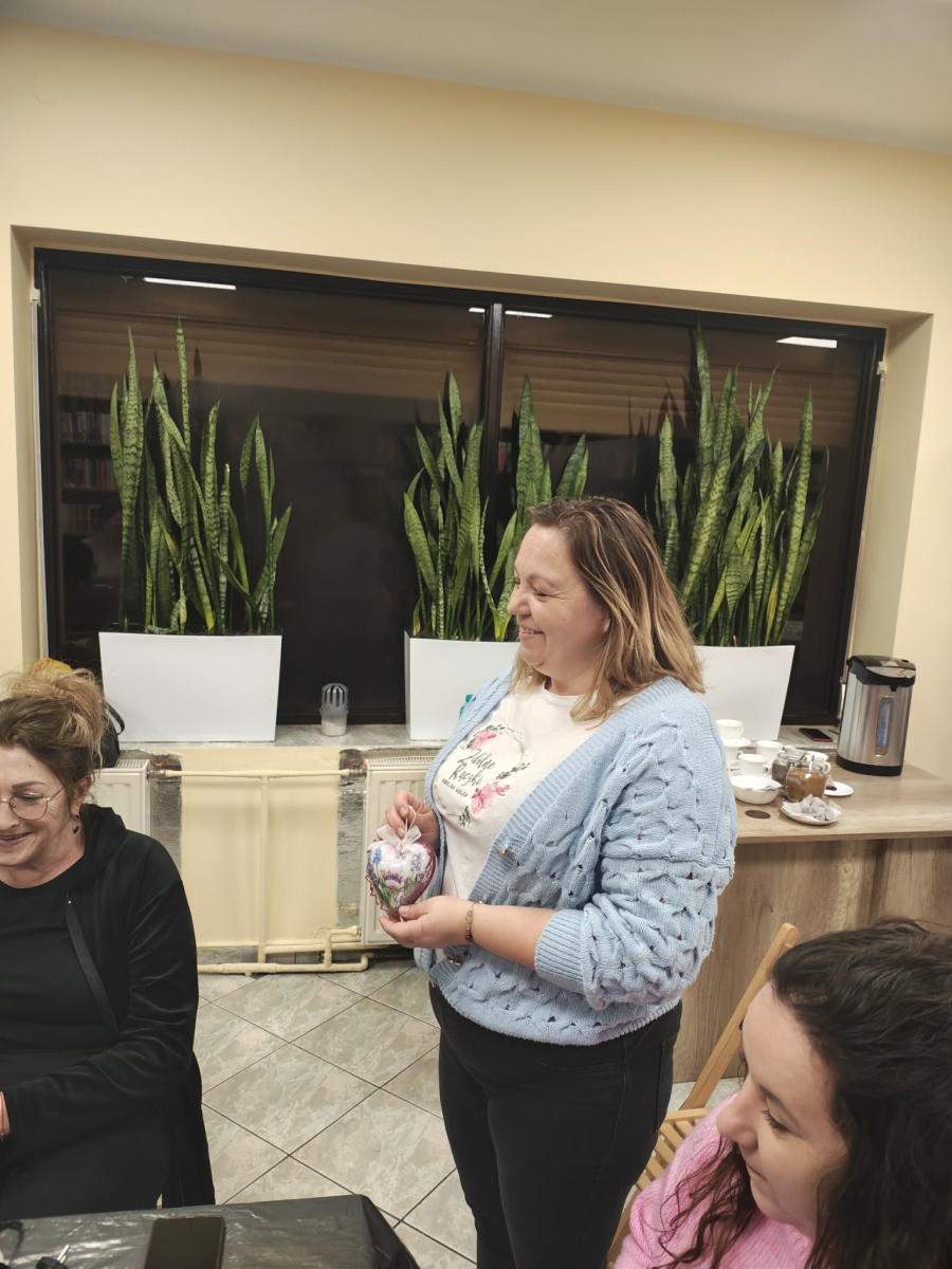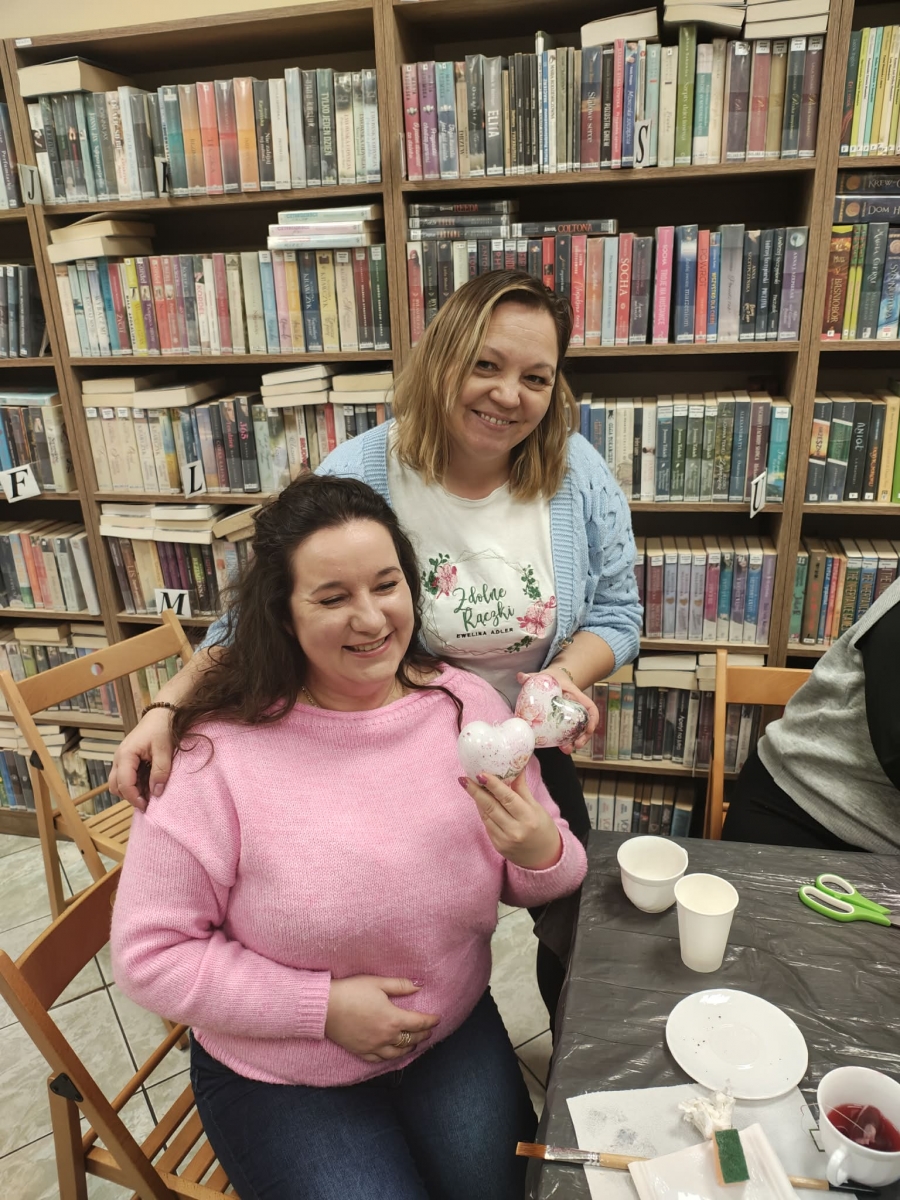 Uczestniczki spotkania przy kawie z ciastem, z dużą dawką humoru, wycinały, kleiły i malowały swoje małe arcydzieła. Efektem finalnym pracy były kolorowe, oryginalne serca - idealny prezent dla ukochanej osoby.