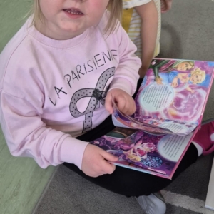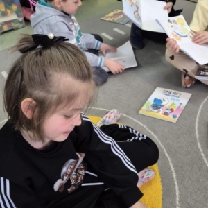 Spotkanie już tradycyjnie rozpoczęło się od głośnego czytania. Najmłodsi usłyszeli bajkę ,,Miłość" autorstwa Corrine Averiss . Temat spotkania krążył wokół Walentynek. Rozmawialiśmy o miłości i uczuciach, którymi obdarowujemy innych.