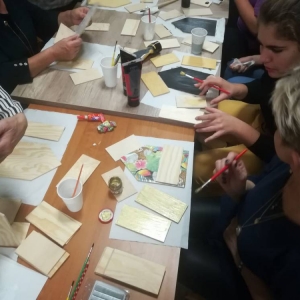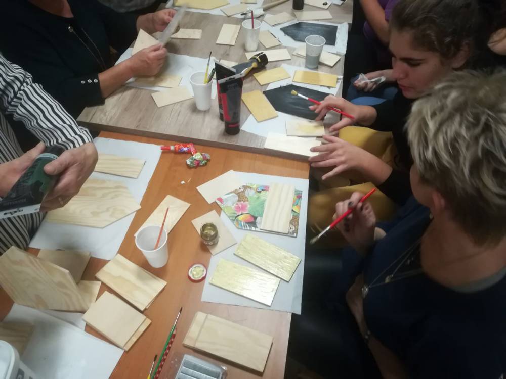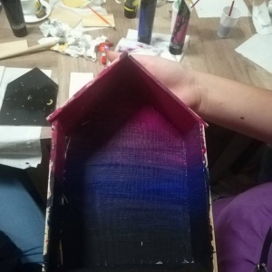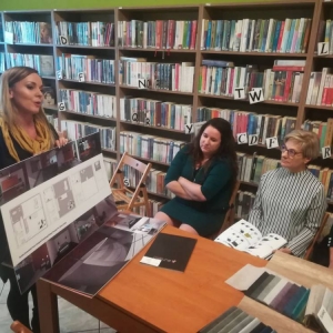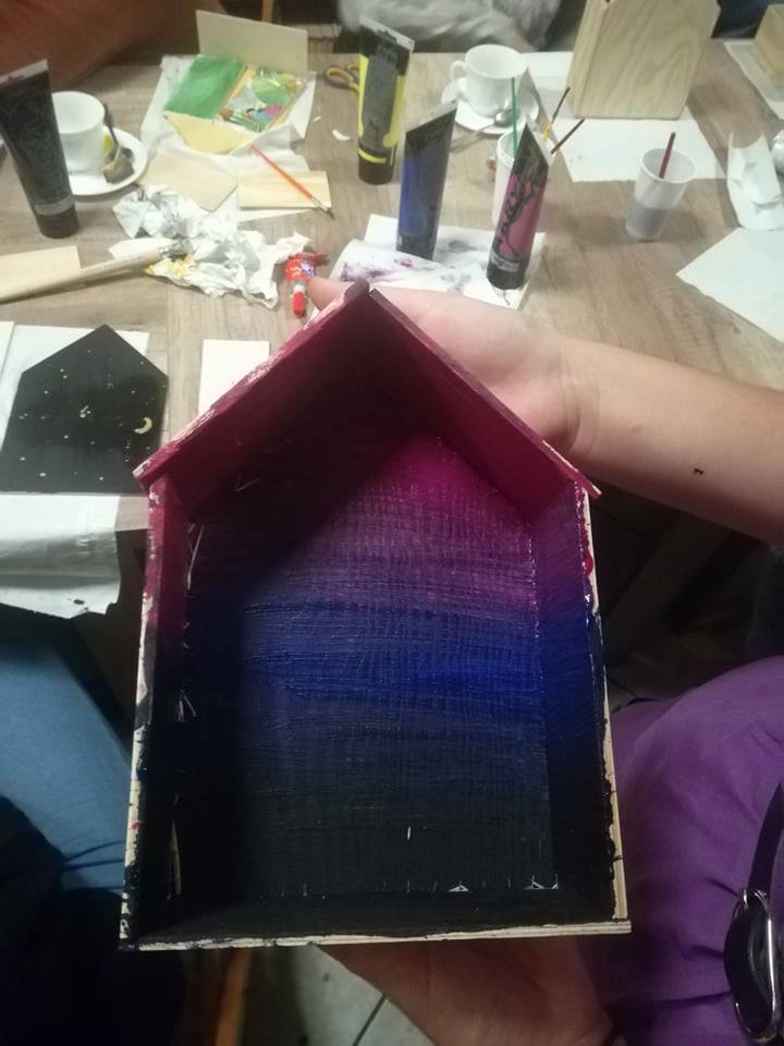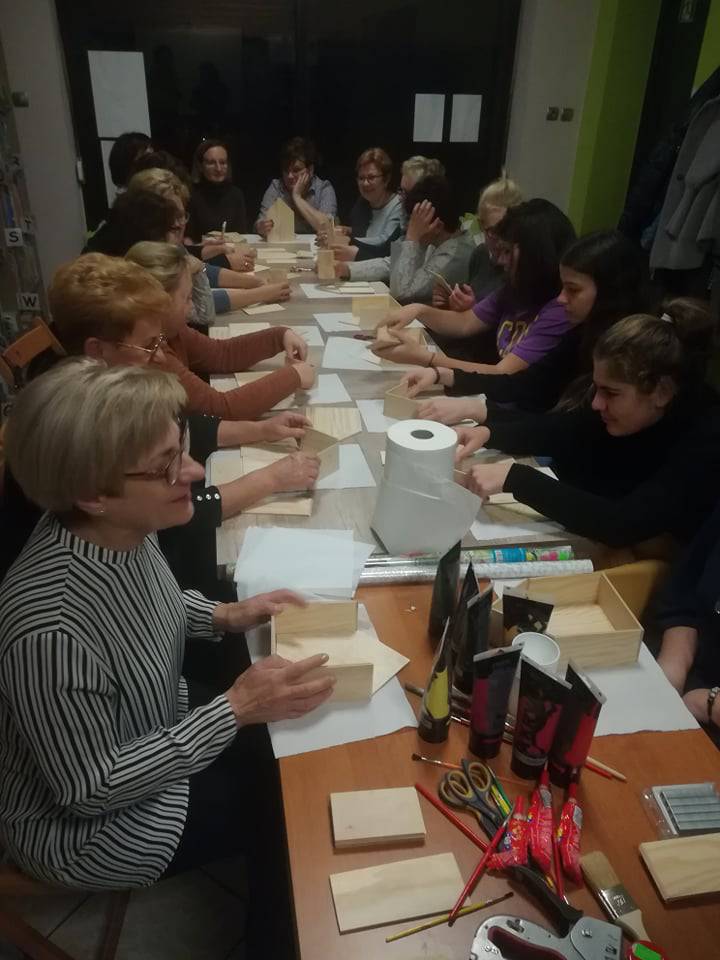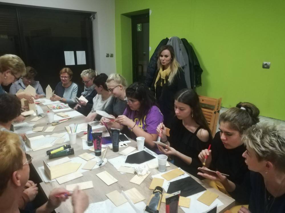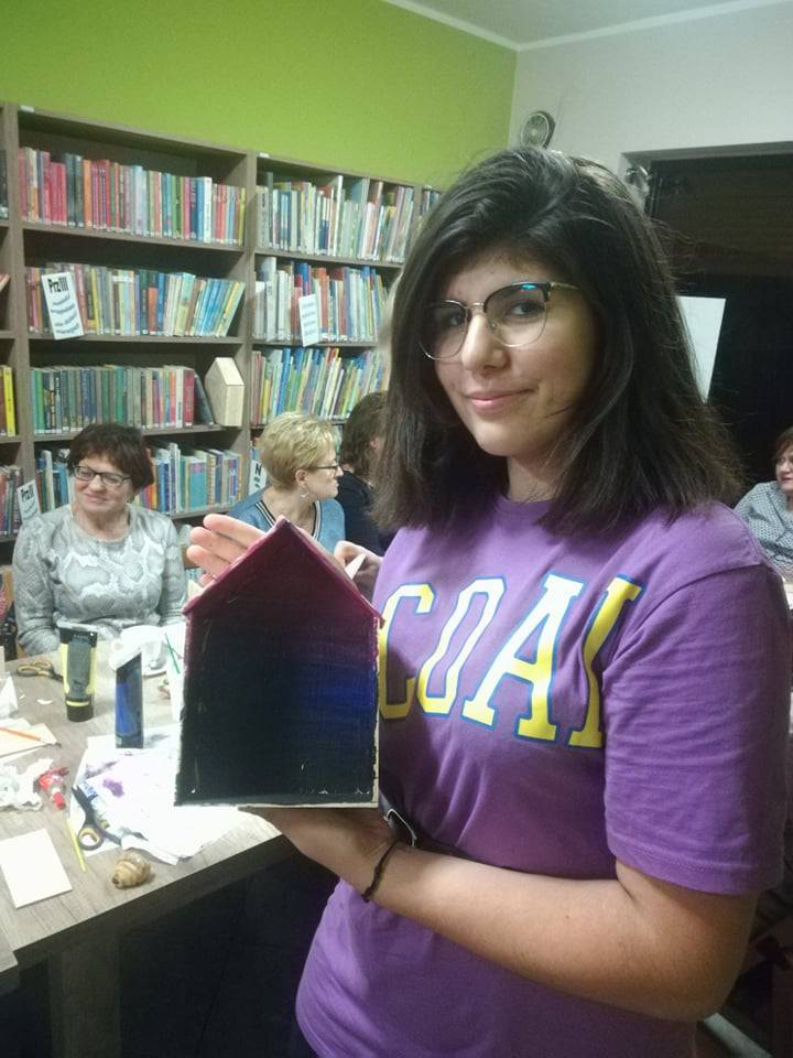 Pani Karolina jest architektem wnętrz, zajmuje się projektowaniem, tworzeniem szkiców, planów budynków. Na wstępie uczestnicy obejrzeli galerię zdjęć aktualnych trendów dotyczących wystroju wnętrz wraz z komentarzem Pani Karoliny. Po części teoretycznej nadszedł czas na praktykę. Goście zabrali się do pracy i rozpoczęli tworzenie domków z drewna. Zaproszone Panie ozdabiały swoje domki farbami, papierami tworząc tym samym nietuzinkowe dzieła, które będą wyjątkową dekoracją każdego domu. :-) Podczas spotkania w bibliotece nie zabrakło również prezentacji książek związanych z plastyką, architekturą, dekoracją wnętrz. Dzięki publikacjom, które można wypożyczyć w naszej placówce z łatwością przyjdzie nam zabawić się kolorami w naszych małych domowych wnętrzach. Po nauce i ciężkiej pracy nadszedł czas na wspólną kawę oraz dyskusje na temat wystroju wnętrz. Rozmowom nie było końca… trwały do późnych godzin wieczornych. :-)