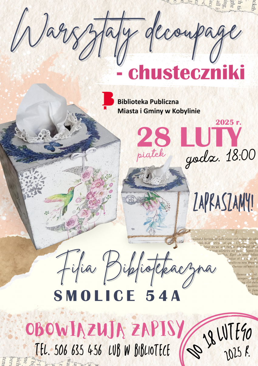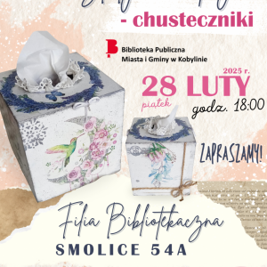 Zapraszamy na warsztaty decoupage, podczas których będziemy ozdabiać chusteczniki! Informacje na plakacie.