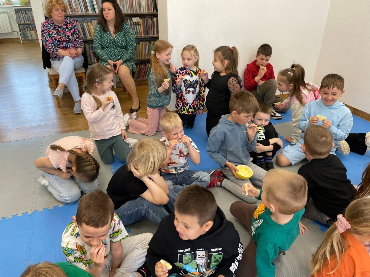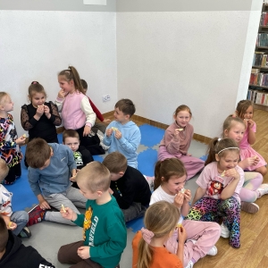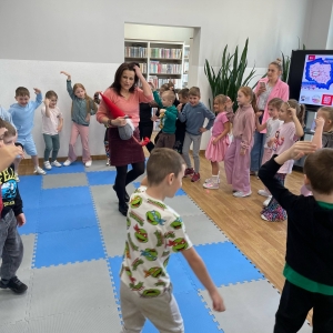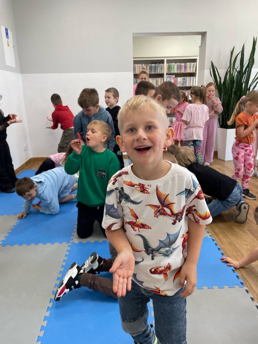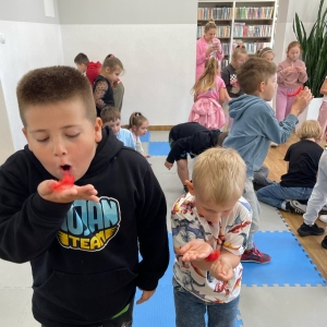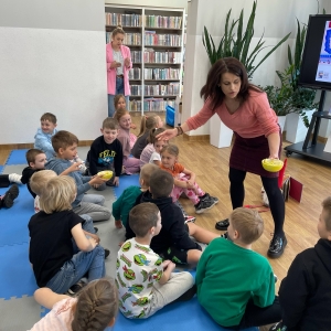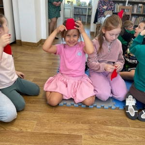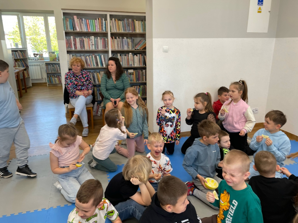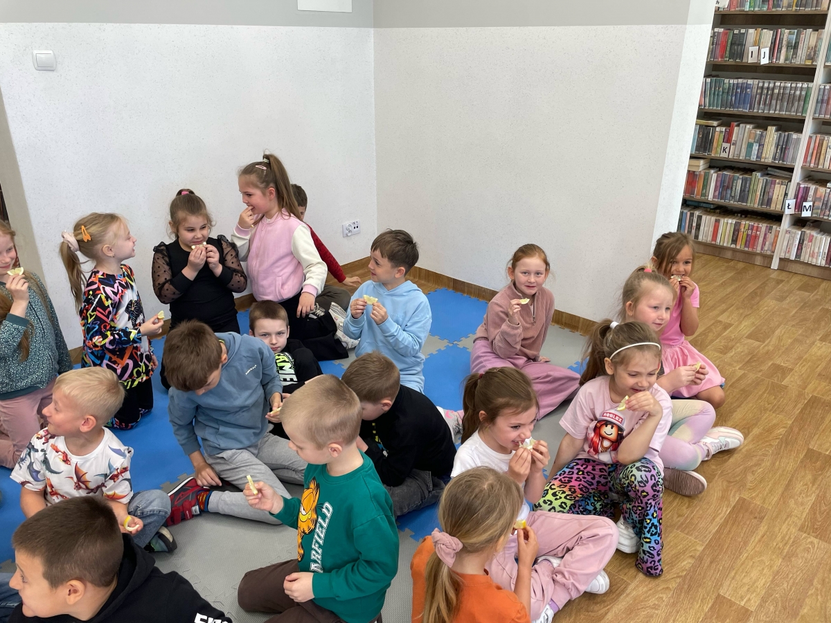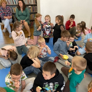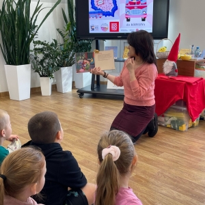 Animatorka wprowadziła dzieci w świat Krasnala w Krzywej Czapce – bohatera książki Wojciecha Widłaka. Na początku każdy zapoznał się z Krasnalem w rytmie wesołej muzyki. Najmłodsi wysłuchali kilka opowieści z książki, na przykład „Opowieść o najstarszym olbrzymie świata”, po której przedszkolacy, tak jak Olbrzym, próbowali zjeść kawałek cytryny, starając się nie zrobić kwaśnej miny. Nie było to łatwe zadanie!