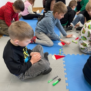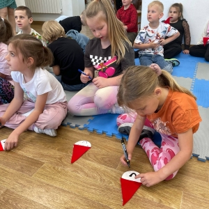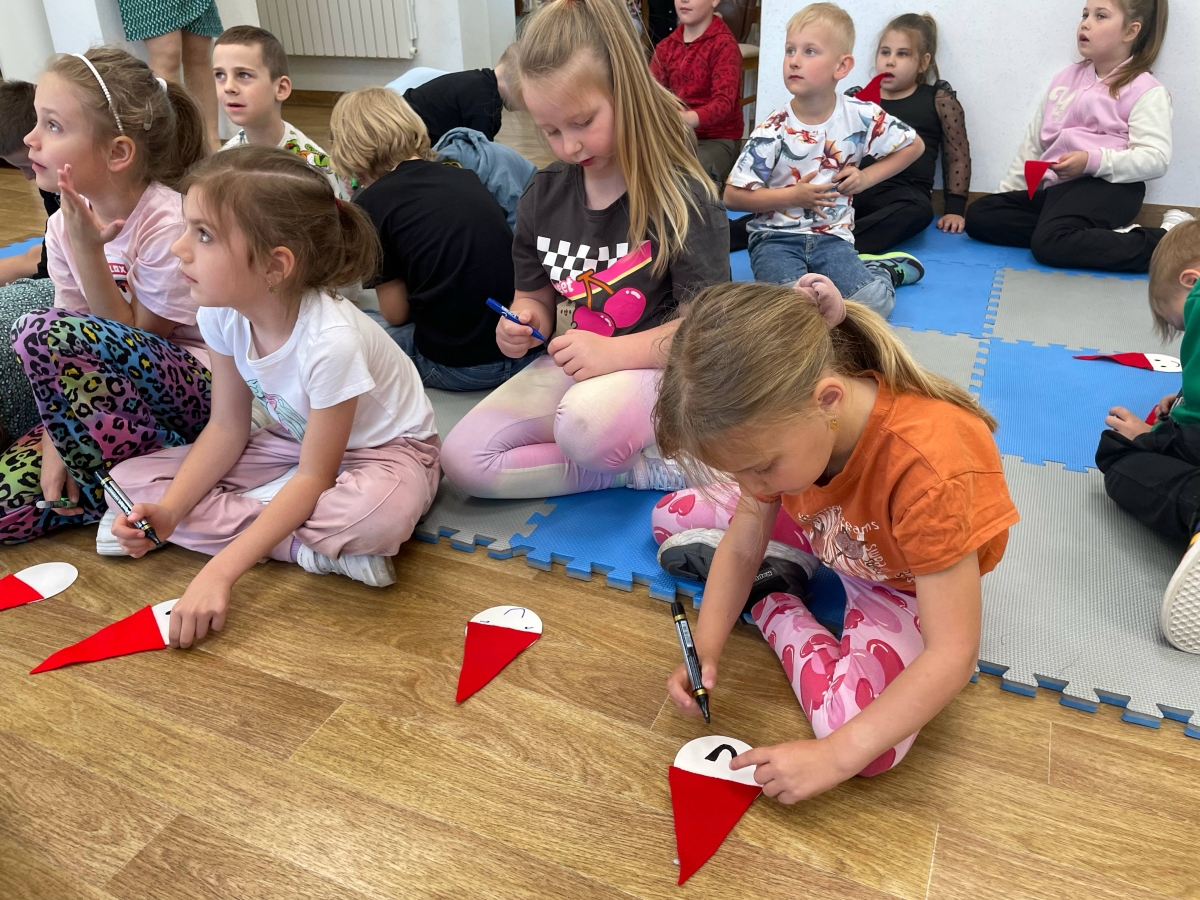 Była także część plastyczna. Przedszkolacy tworzyli własnego Krasnala w Krzywej Czapce. Piękne efekty ich pracy prezentujemy w galerii. Spotkanie zakończyło się radośnie wspólnymi tańcami. Każdy przedszkolak otrzymał kolorowanki w ramach realizowanego projektu „Mała książka w drodze”.