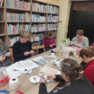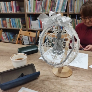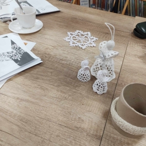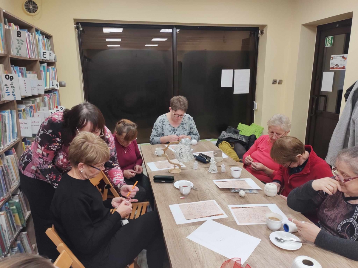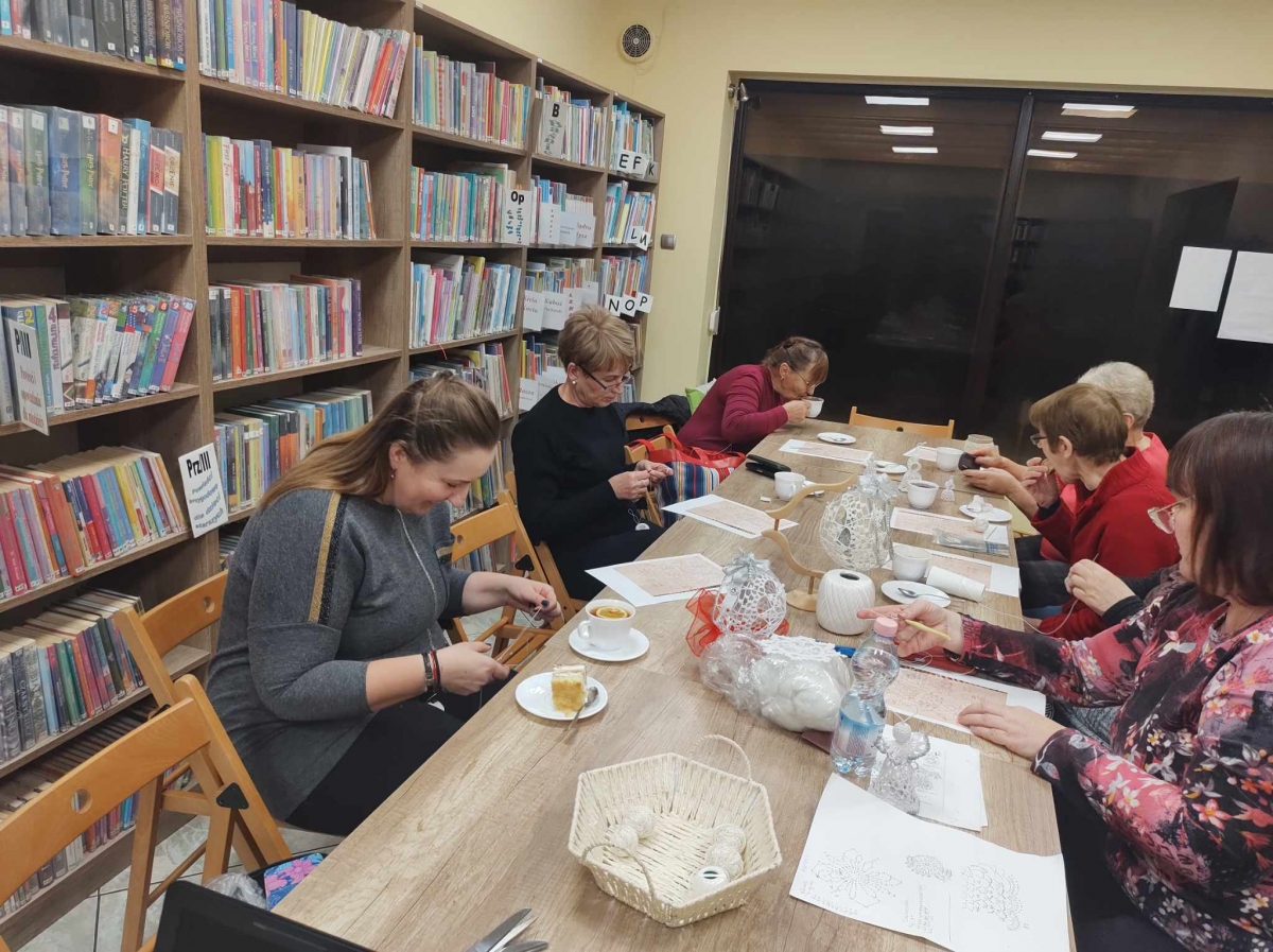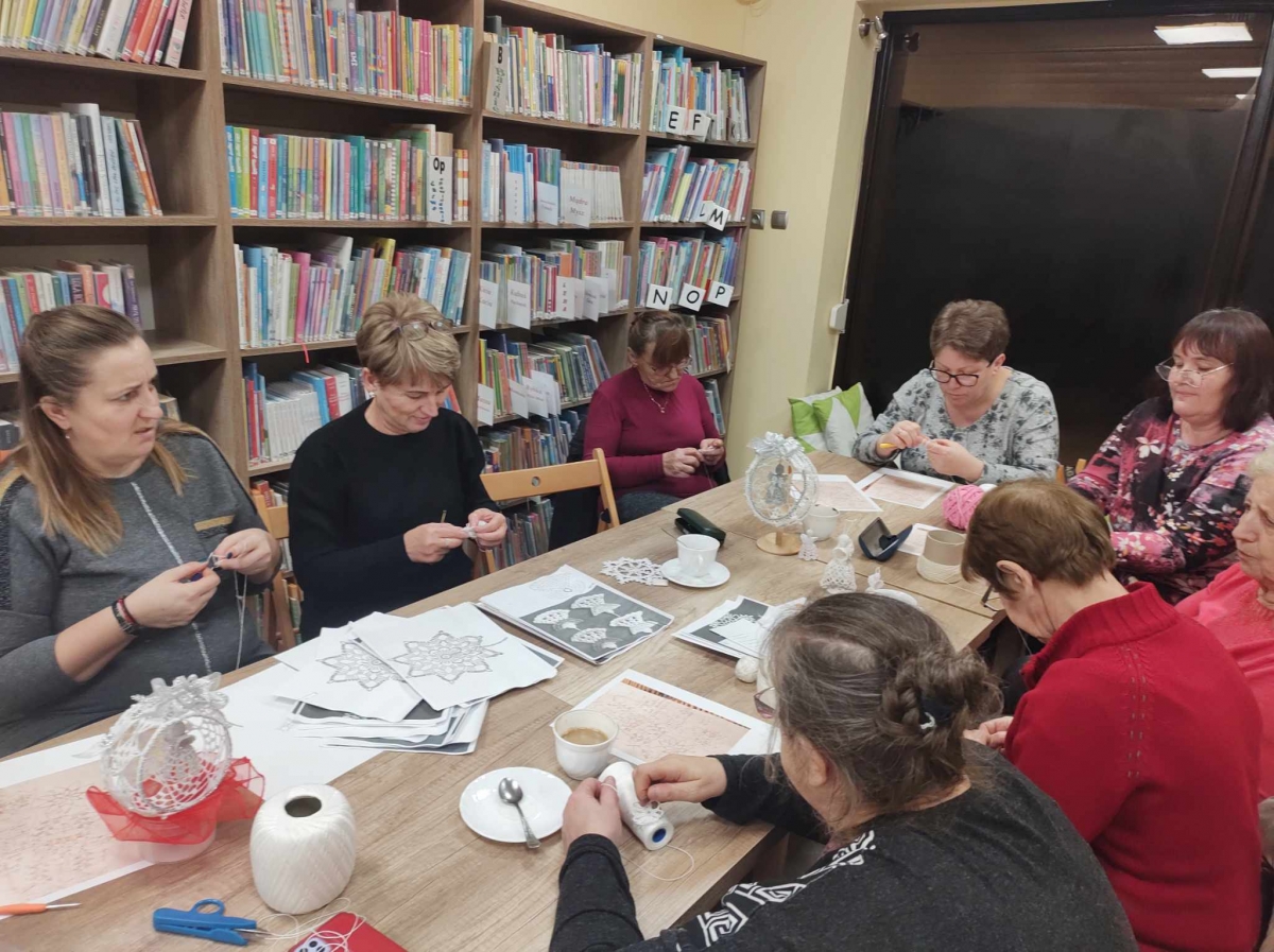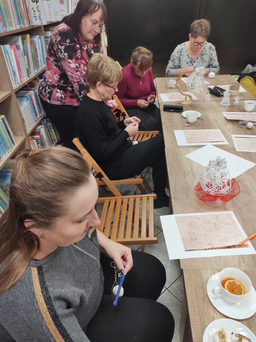 17 listopada 2023 r. w Filii Biblioteki Publicznej w Smolicach odbyło się kolejne spotkanie z cyklu Rękodzieło w bibliotece. W piątkowe popołudnie do biblioteki zawitały panie, które pod okiem prowadzącej, Pani Emilii Kaczmarek ze Smolic dziergały świąteczne ozdoby. Tym razem były to bombki. Nasze niezawodne czytelniczki popijając wyśmienitą kawę i jedząc słodki placek tworzyły kolejne słupki, półsłupki, oczka łańcuszka, oczka ścisłe. Z tych splotów powstały piękne bombki z aniołkami, którymi Panie przyozdobią swoje drzewka bożonarodzeniowe.