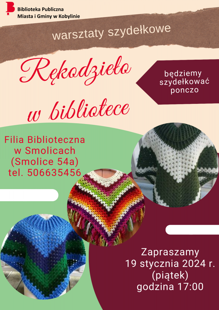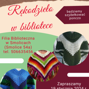 Filia Biblioteczna w Smolicach zaprasza na kolejne warsztaty rękodzielnicze - Rękodzieło w bibliotece. Spotkanie odbędzie się w piątek 19 stycznia o godzinie 17:00 w Filii Bibliotecznej w Smolicach.