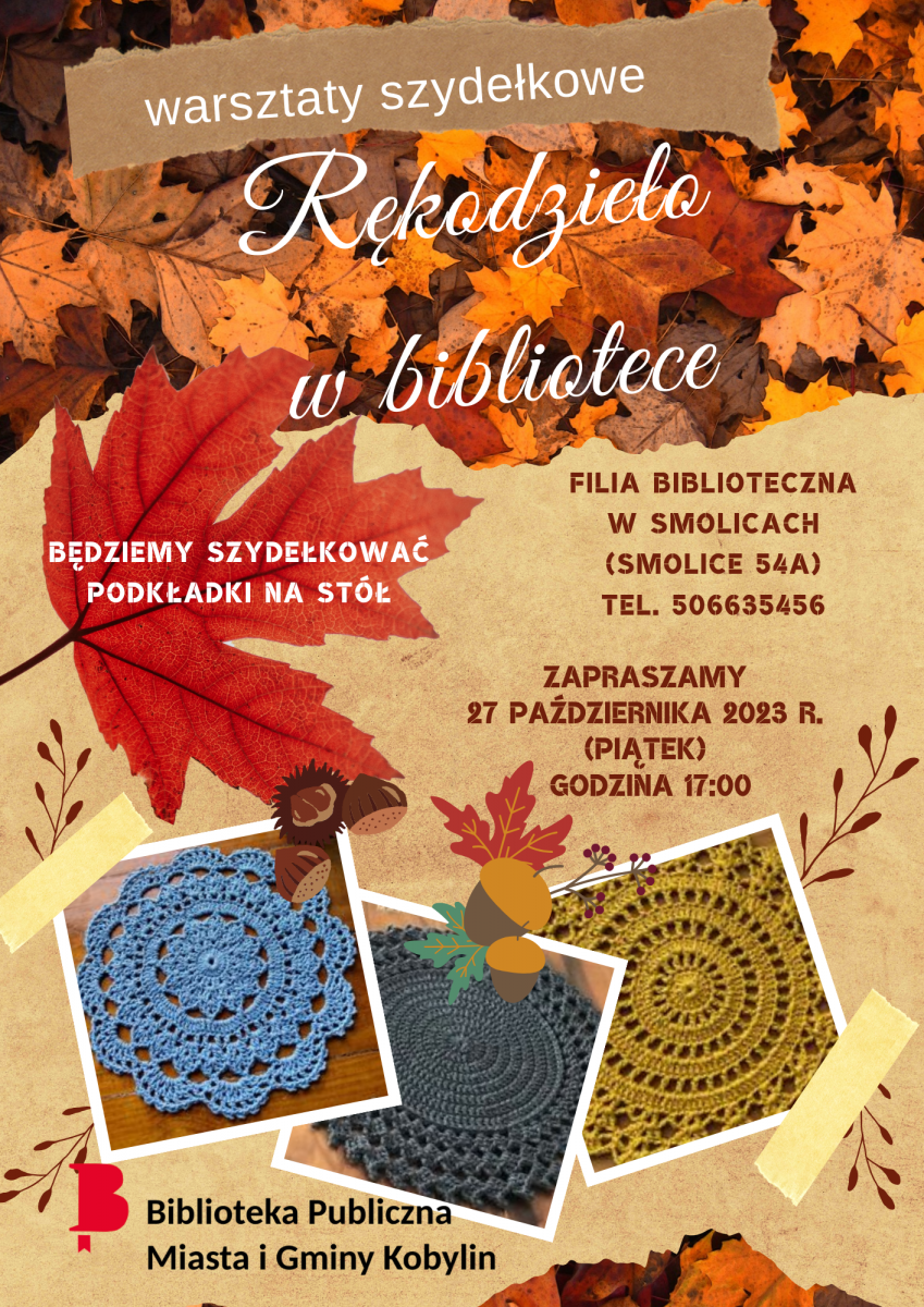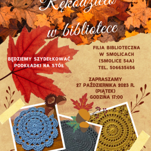 Filia Biblioteczna w Smolicach zaprasza na warsztaty rękodzielnicze - Rękodzieło w bibliotece. Spotkanie odbędzie się w piątek 27 października o godzinie 17:00 w Filii Bibliotecznej w Smolicach.