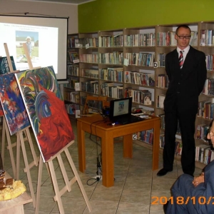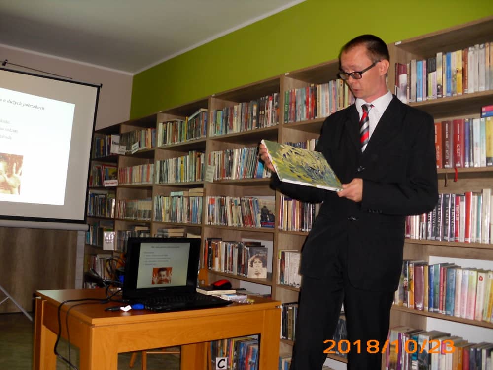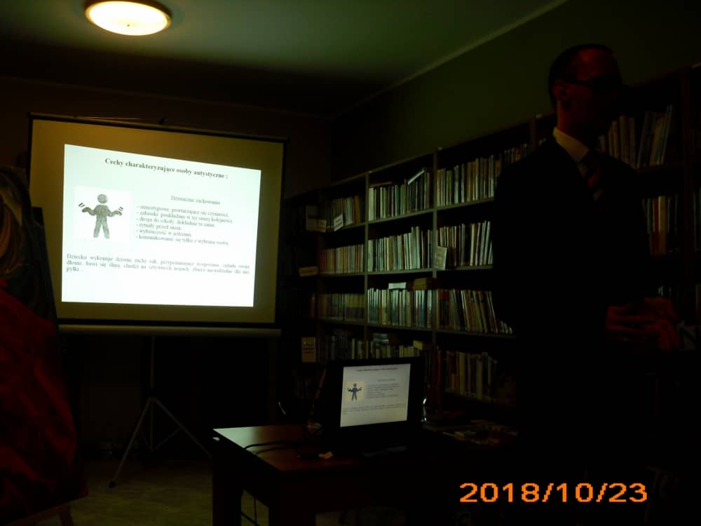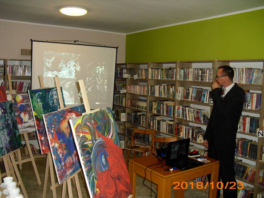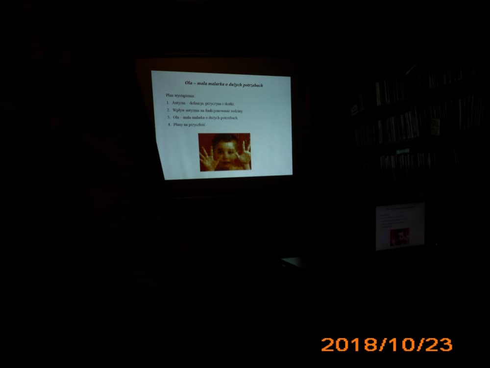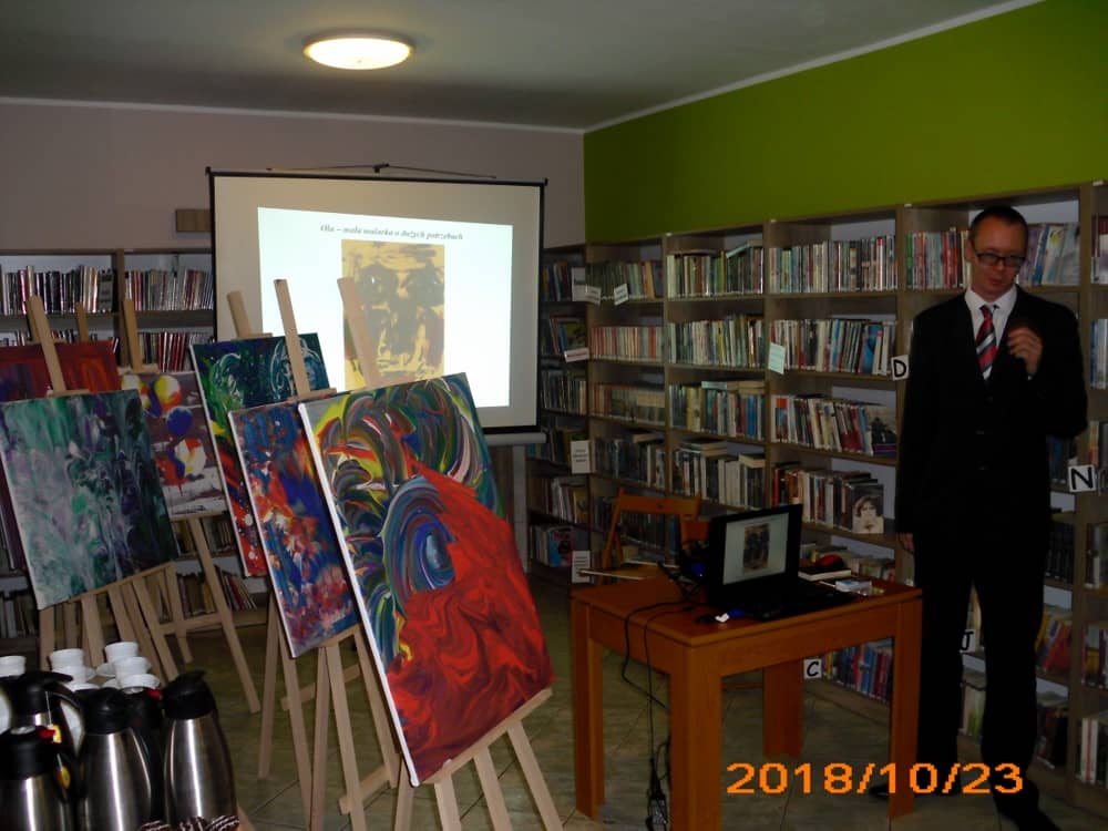 Spotkanie poprowadził tata dziewczynki, Pan Dominik Sikorski, który szerzej przedstawił zgromadzonym gościom czym jest autyzm, jak się objawia, na co należy zwrócić uwagę podczas rozpoznawania symptomów zaburzenia. Pan Dominik opowiedział także o Oli i jej wielkim talencie. Mieliśmy przyjemność obejrzeć oryginalne dzieła młodej artystki oraz film, na którym dziewczynka tworzy jeden z obrazów.