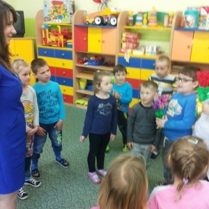 Miłym akcentem były upominki dla dzieci w postaci zakładek i cukierków. Przedszkolaki odwdzięczyły się pięknymi tulipanami, które przygotowały własnoręcznie.