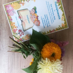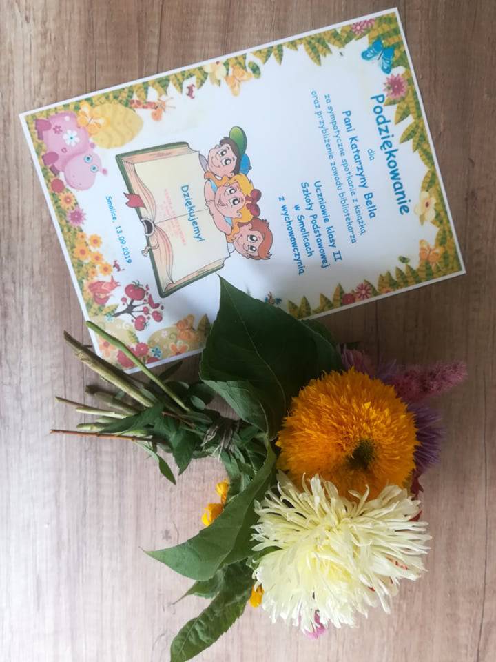 Najmłodsi otrzymali zakładki do książek oraz słodki upominek, a panią bibliotekarkę obdarowali pięknym bukietem kwiatów oraz kolorowym podziękowaniem. :-)