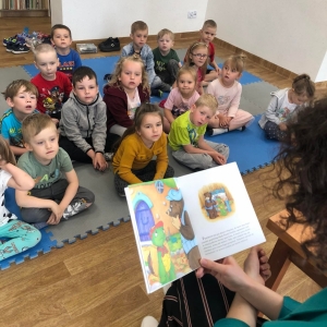Głośne czytanie było obowiązkowym elementem spotkania. Pani bibliotekarka przeczytała bajkę „Franklin wybacza siostrzyczce”, po czym wspólnie dzieliliśmy się swoimi doświadczeniami z wybaczaniem oraz reakcją na przeprosiny.