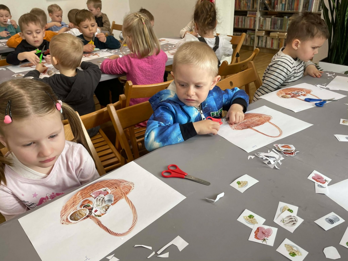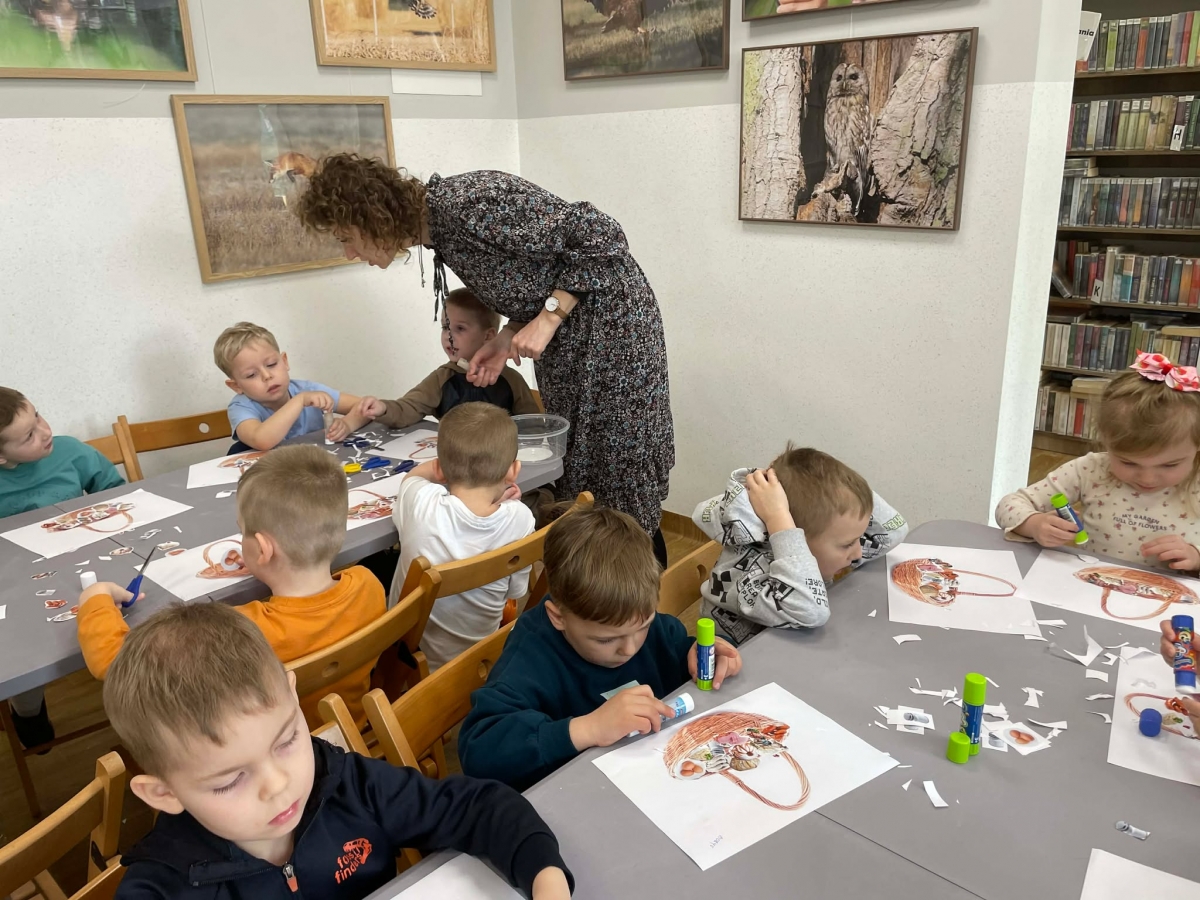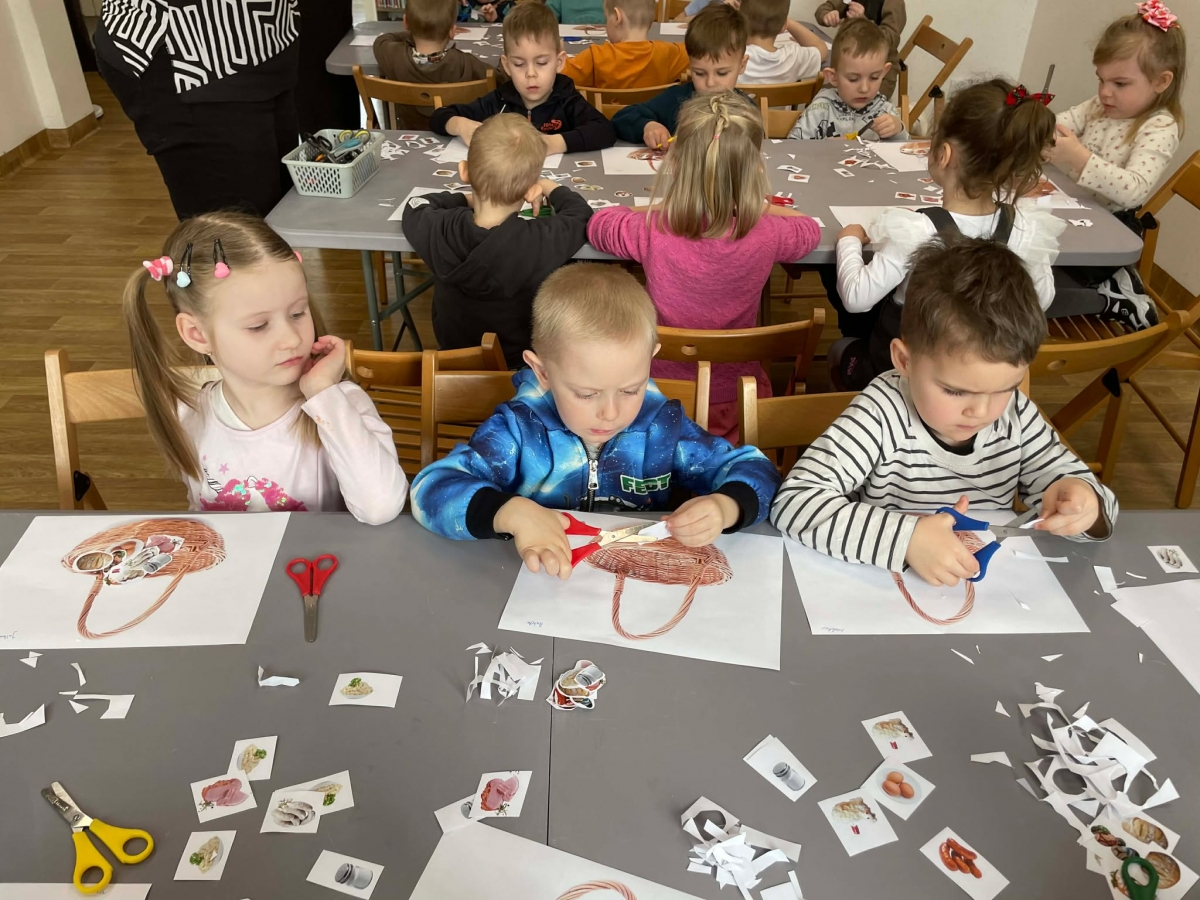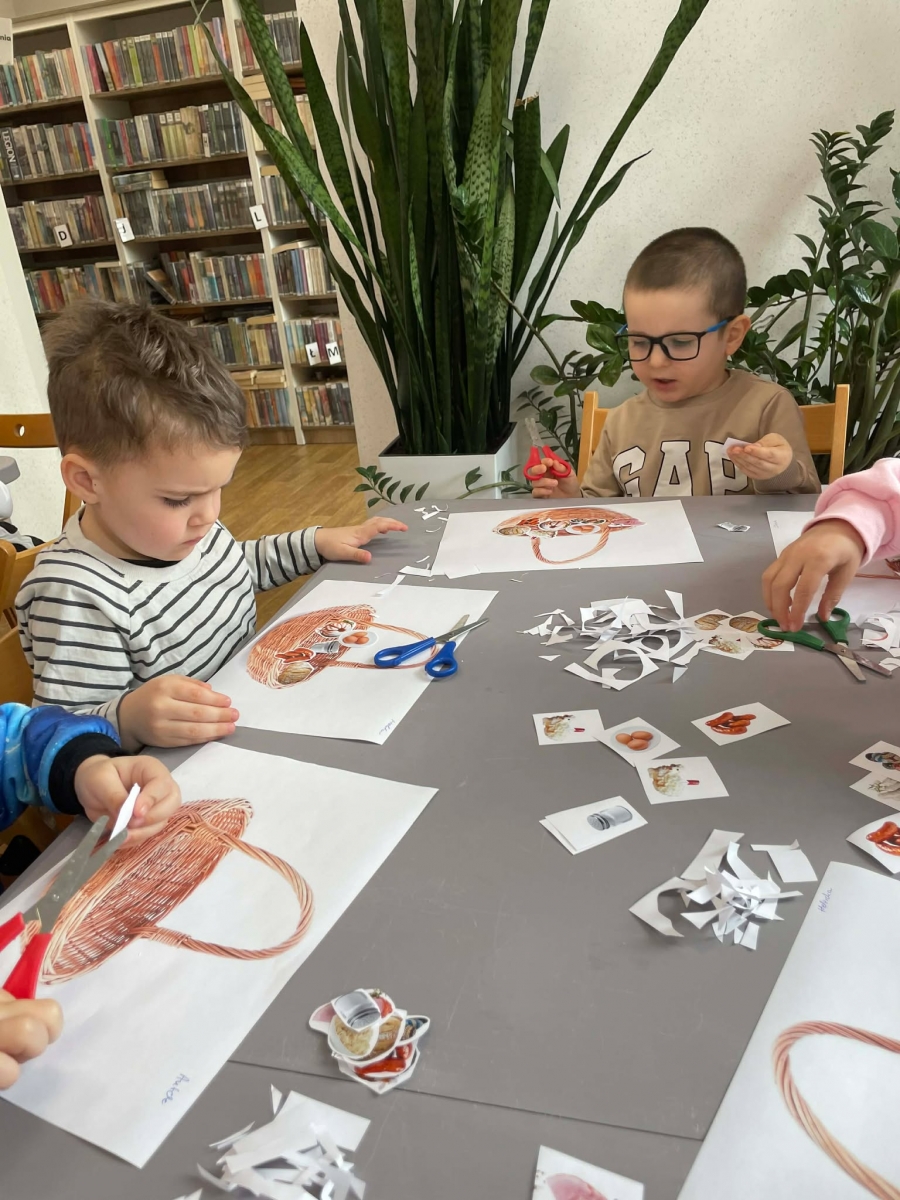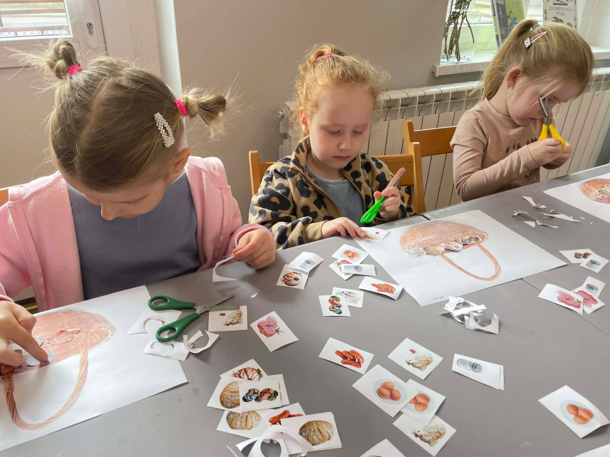 Na zakończenie spotkania uczestnicy zajęć otrzymali własne papierowe koszyczki wielkanocne. Wycinając z papieru wędliny, chleb, baranka z masła, babkę, chrzan, sól i jajka, samodzielnie komponowali swoje świąteczne koszyczki.