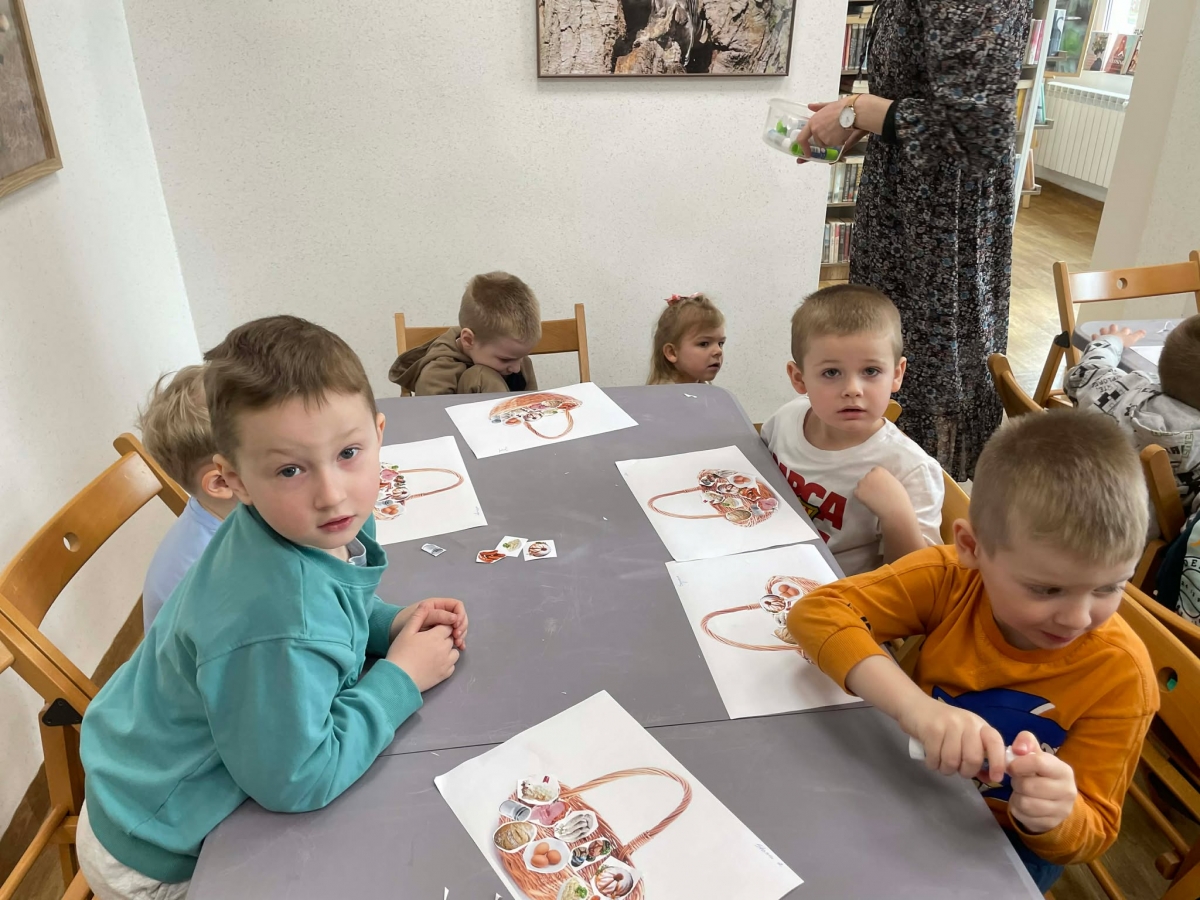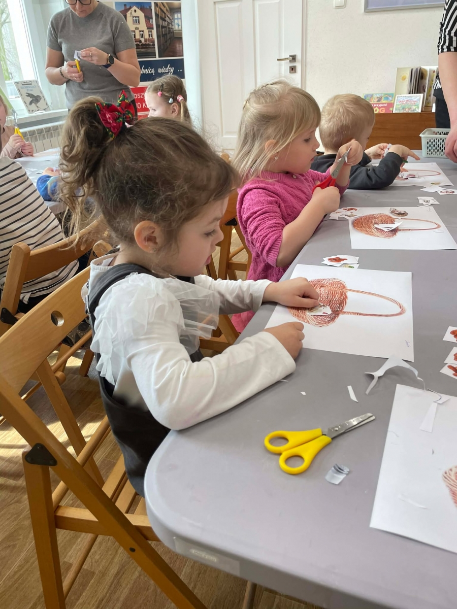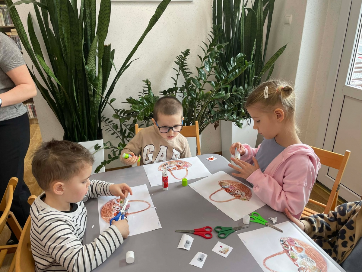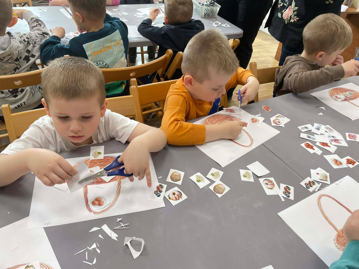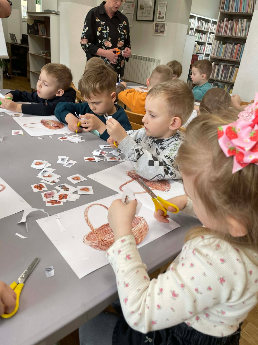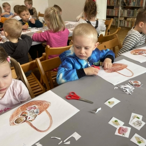 Na zakończenie spotkania uczestnicy zajęć otrzymali własne papierowe koszyczki wielkanocne. Wycinając z papieru wędliny, chleb, baranka z masła, babkę, chrzan, sól i jajka, samodzielnie komponowali swoje świąteczne koszyczki.