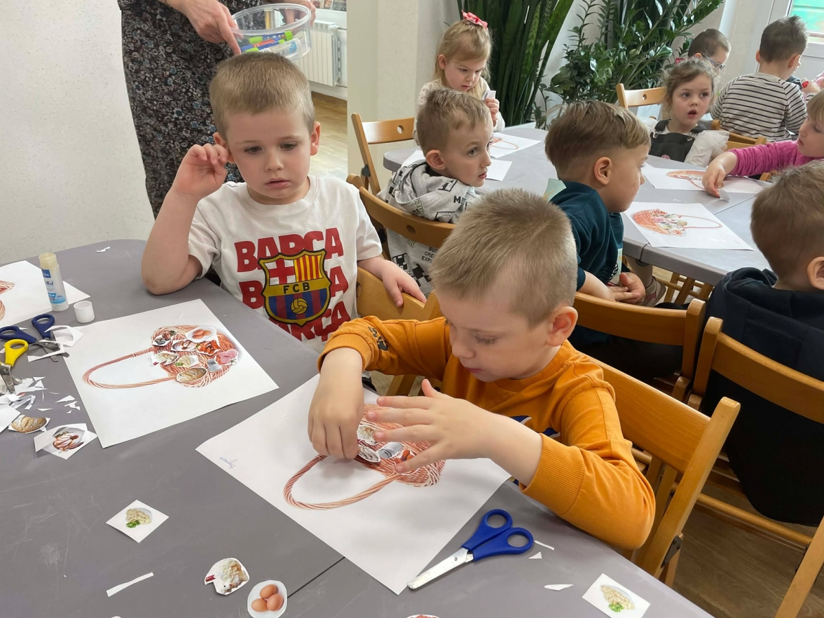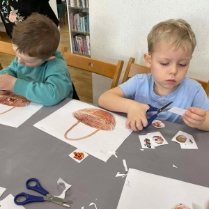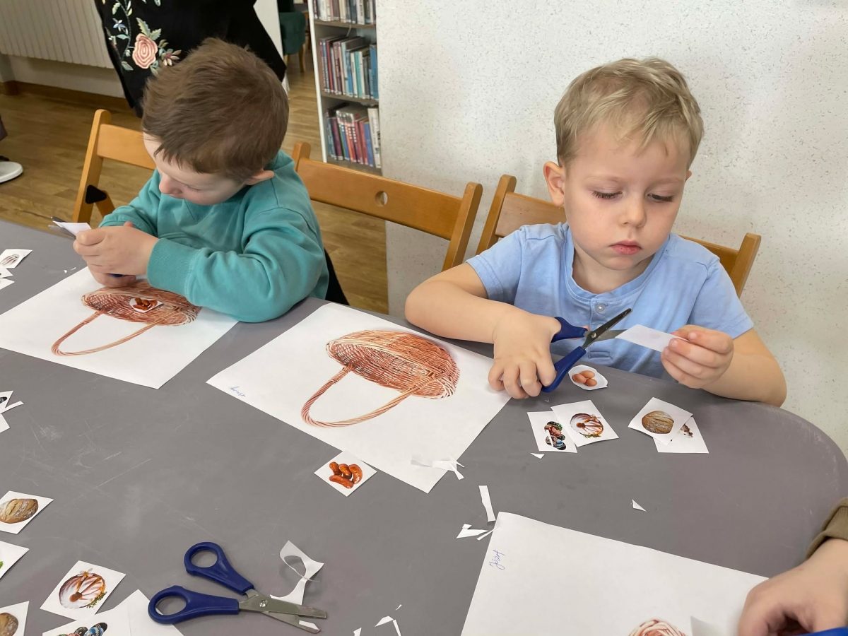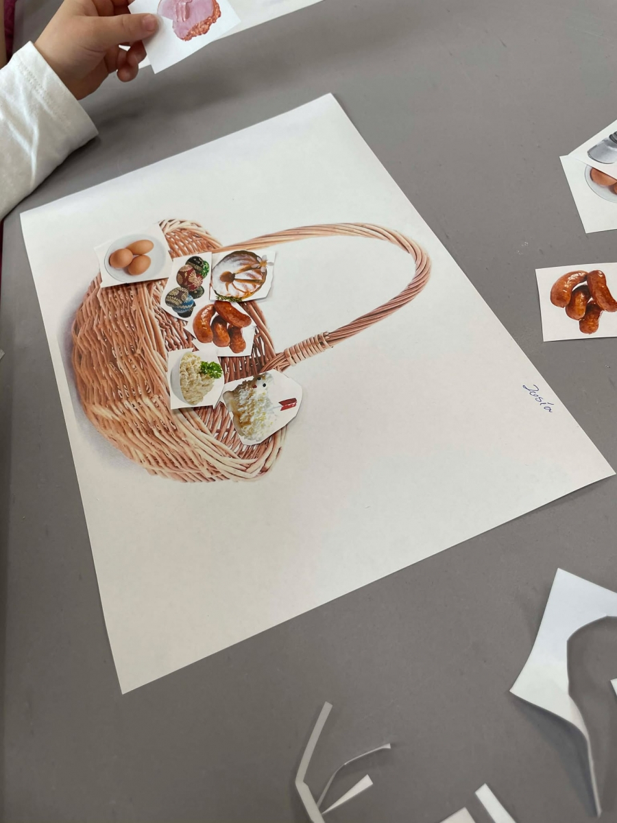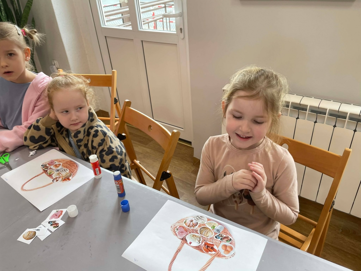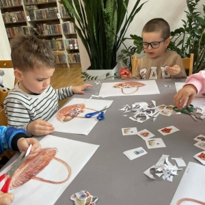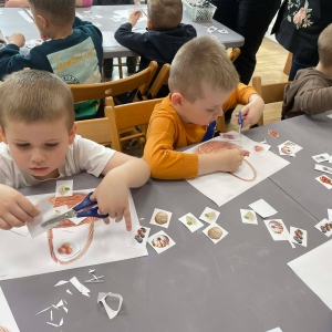 Na zakończenie spotkania uczestnicy zajęć otrzymali własne papierowe koszyczki wielkanocne. Wycinając z papieru wędliny, chleb, baranka z masła, babkę, chrzan, sól i jajka, samodzielnie komponowali swoje świąteczne koszyczki.
