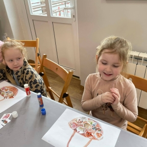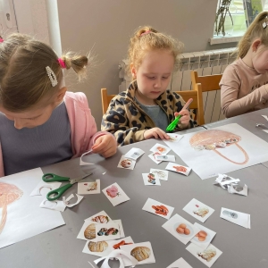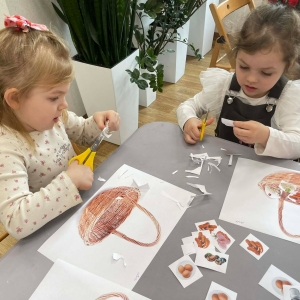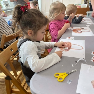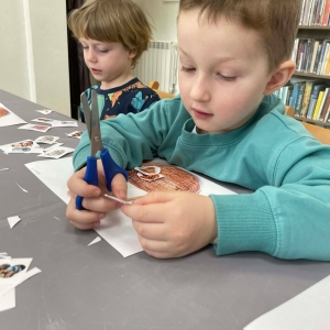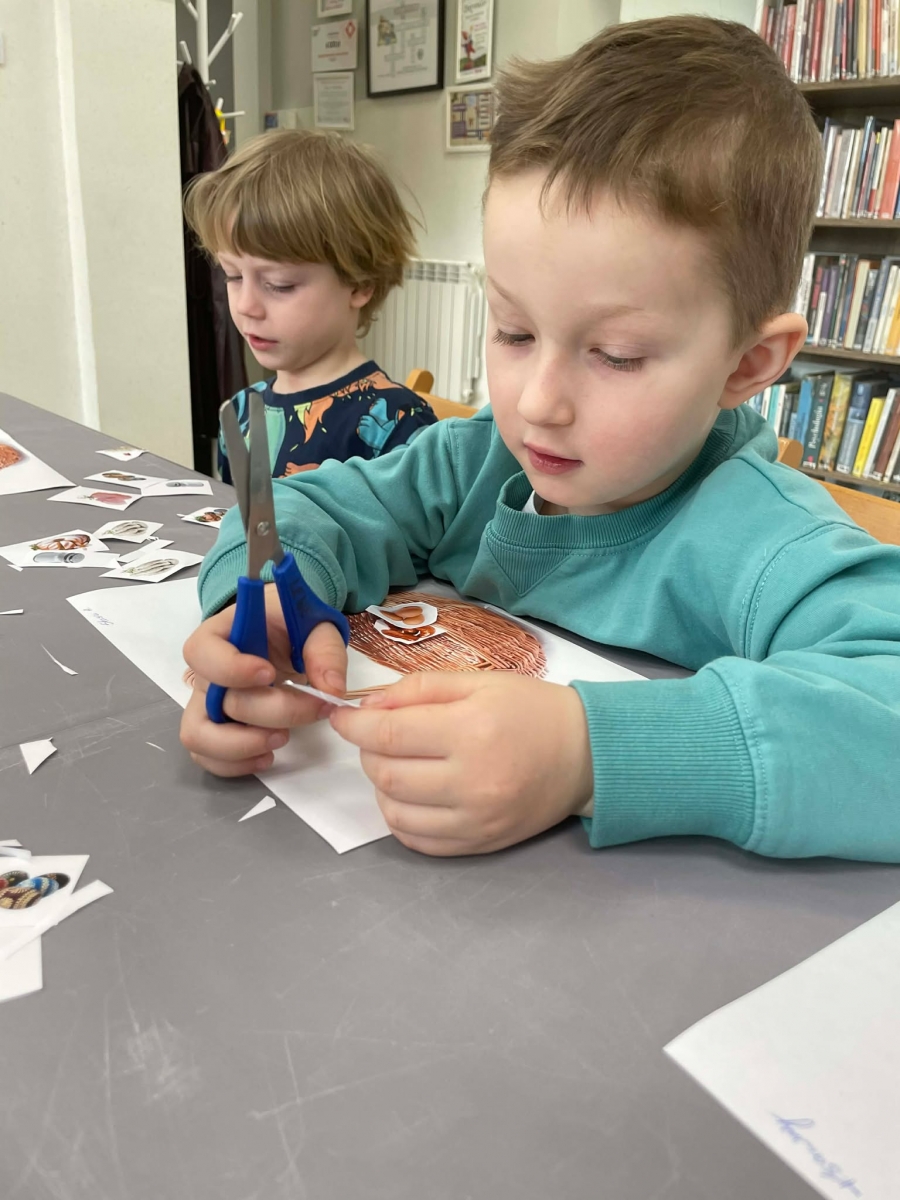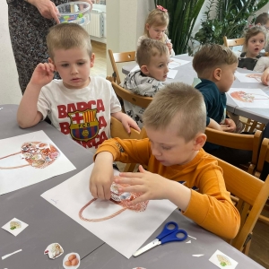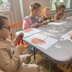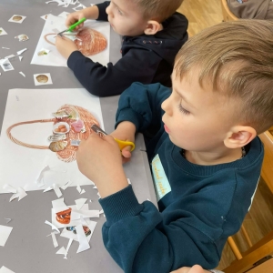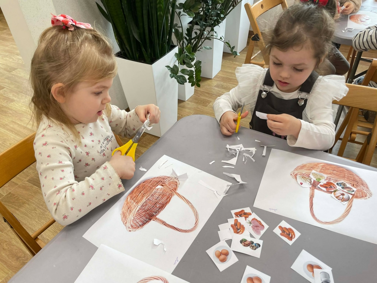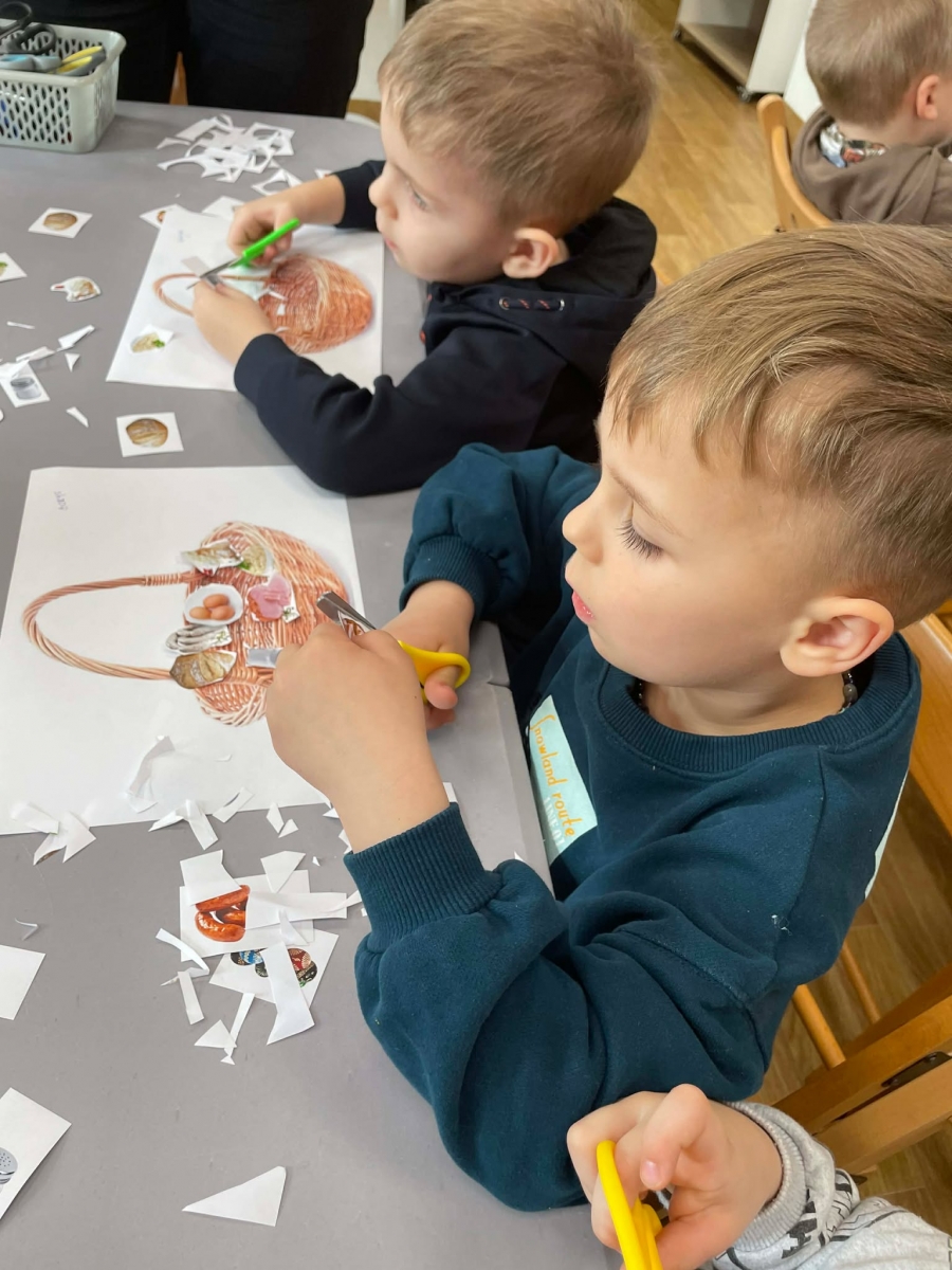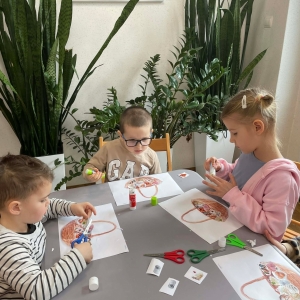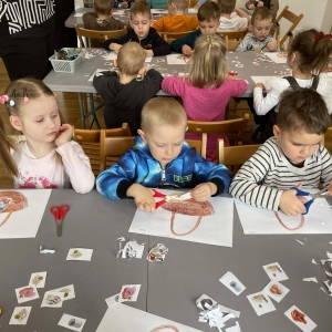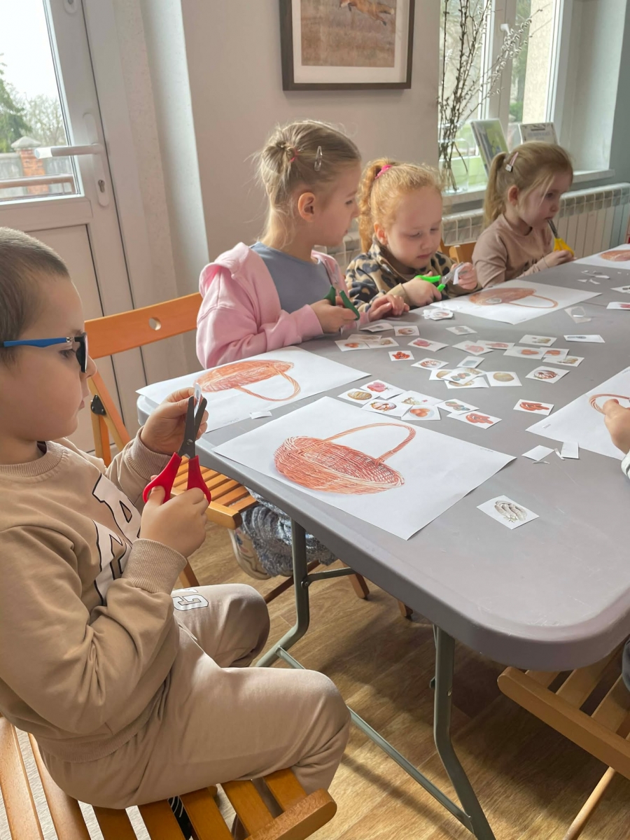 Na zakończenie spotkania uczestnicy zajęć otrzymali własne papierowe koszyczki wielkanocne. Wycinając z papieru wędliny, chleb, baranka z masła, babkę, chrzan, sól i jajka, samodzielnie komponowali swoje świąteczne koszyczki.