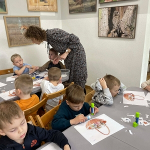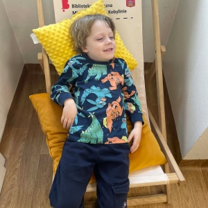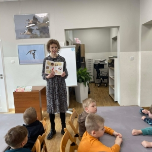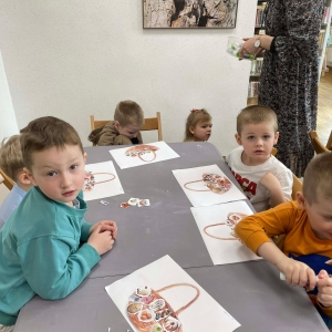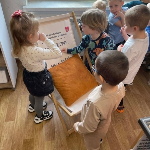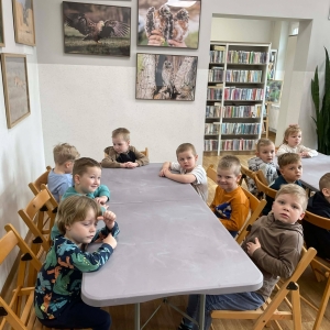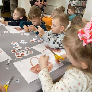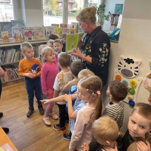 W galerii znajdują się zdjęcia dzieci z Przedszkola w Kobylinie (grupa Żabki). Podczas spotkania najłmodsi zwiedzili bibliotekę, a następnie usłyszeli o znaczeniu Świąt Wielkanocnych oraz o znanej święconce. Dzieci samodzielnie komponowały swoje świąteczne koszyczki, wycinając z papieru wielkanocne potrawy. Większa część zajęć odbywała się w holu biblioteki, gdzie przedszkolacy siedzieli na krzesłach przy stołach.