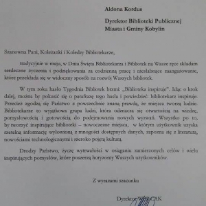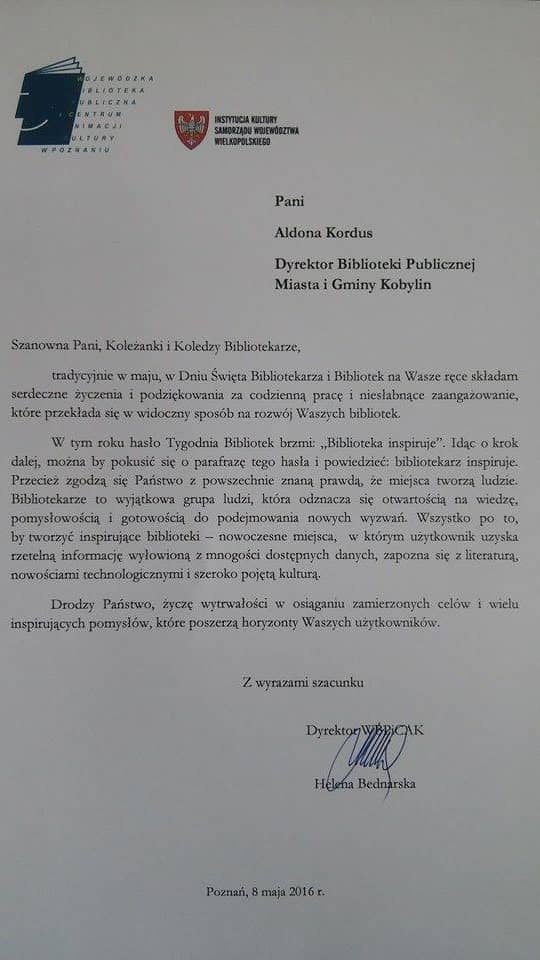 W dniu 12 maja 2016 roku kobylińskie bibliotekarki gościły Burmistrza Kobylina Bernarda Jasińskiego i Pawła Wasielewskiego. Burmistrz na ręce Aldony Kordus- Dyrektora Biblioteki złożył bukiet kwiatów oraz życzenia z okazji Dnia Bibliotekarza i Bibliotek. Został również odczytany list, który przekazała Dyrektor Wojewódzkiej Biblioteki Publicznej i Centrum Animacji Kultury w Poznaniu Helena Bednarska. List zawierał życzenia z okazji święta bibliotekarek oraz podziękowania za niesłabnące zaangażowanie w codzienną prac, które przekłada się w widoczny sposób na rozwój biblioteki.